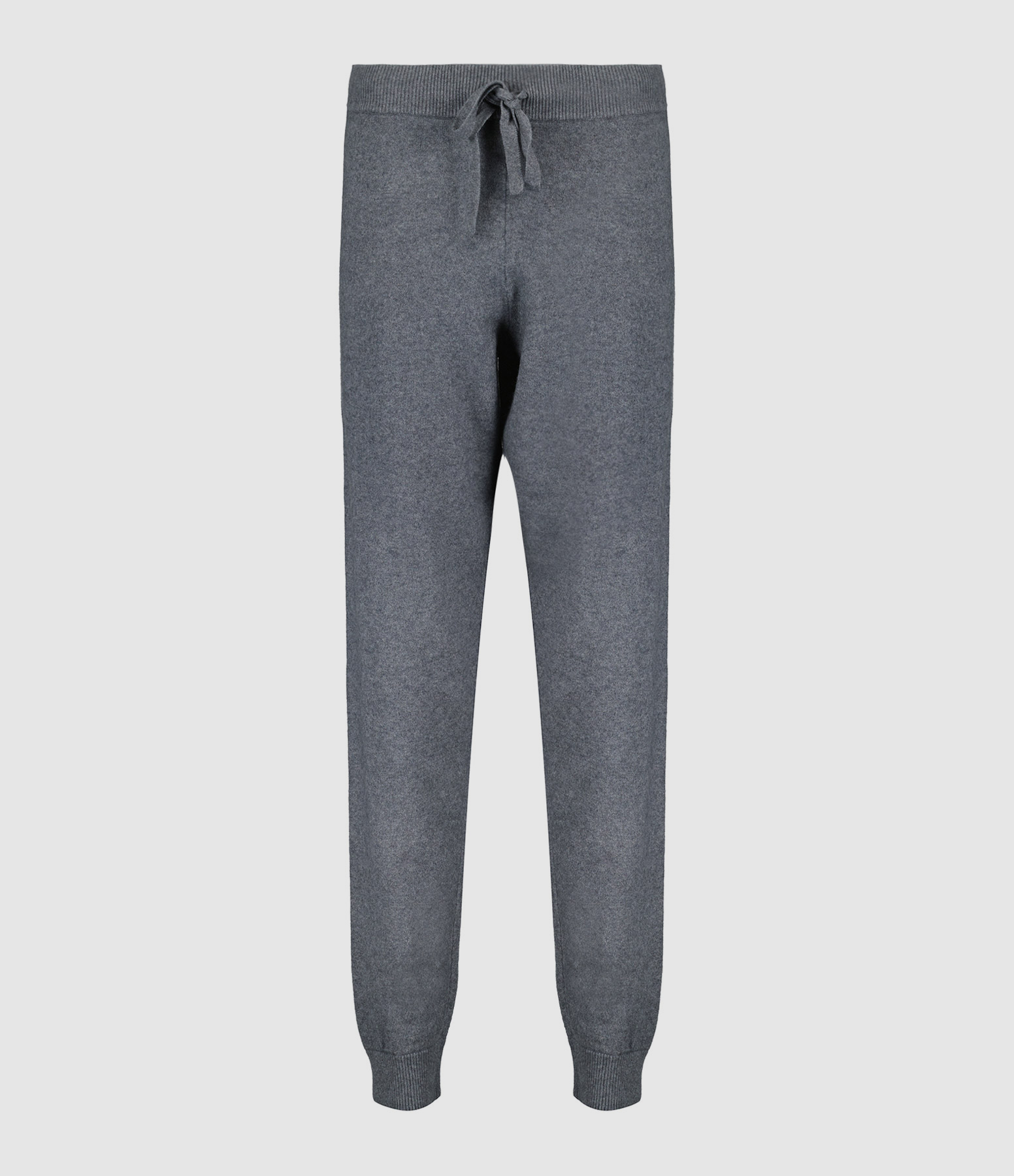 Pantalon en maille de coton mélangé anthracite chiné. Taille côtelée et élastiquée avec liens de serrage. Coupe droite. Base droite resserrée et côtelée.