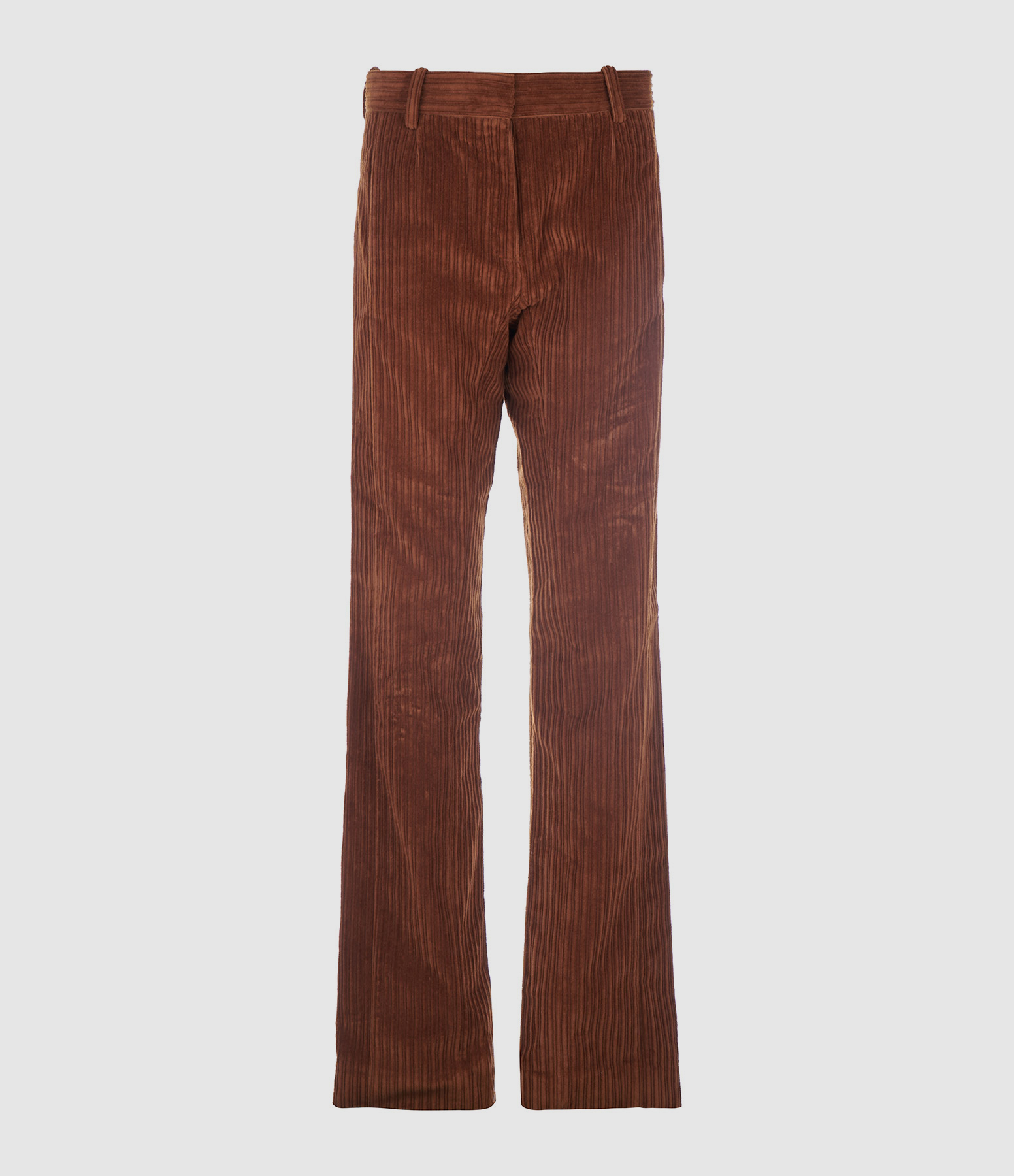 Pantalon droit en velours côtelé marron. Taille haute. Deux poches fendues à l'avant et deux poches passepoilées à l'arrière. Fermeture par zip et crochet. Coupe droite. Passants pour ceinture.
