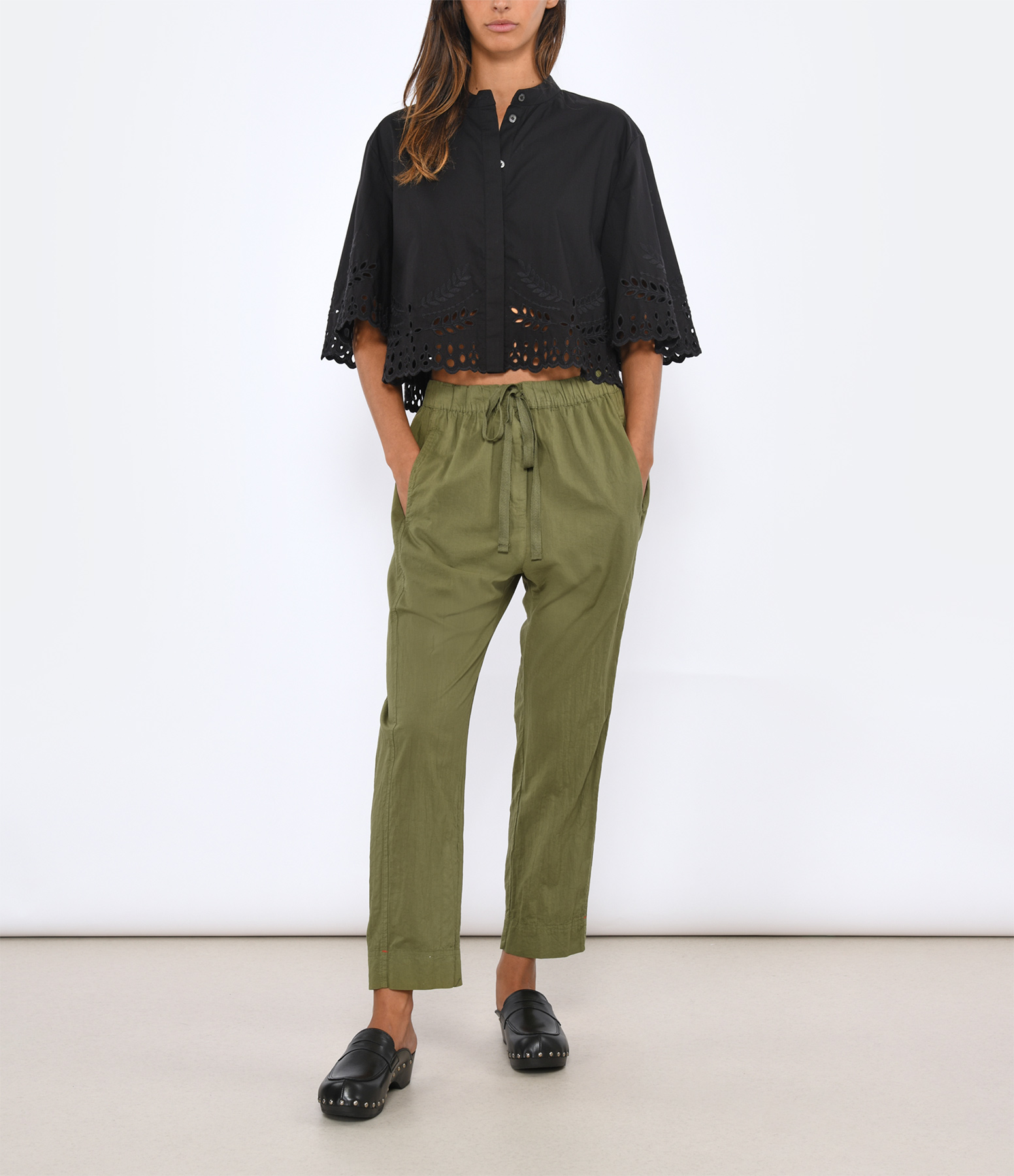 Pantalon en coton vert. Taille élastiquée avec liens de serrage. Deux poches italiennes. Non doublé.