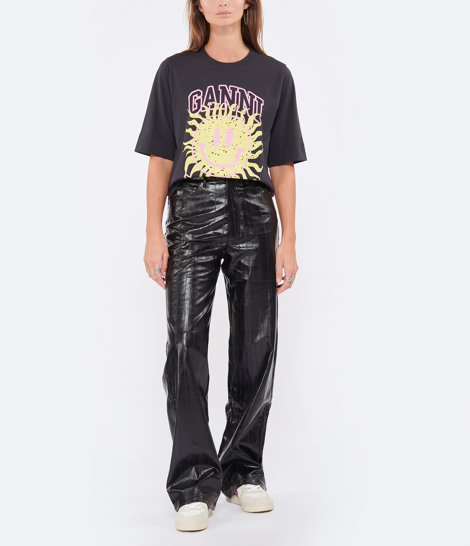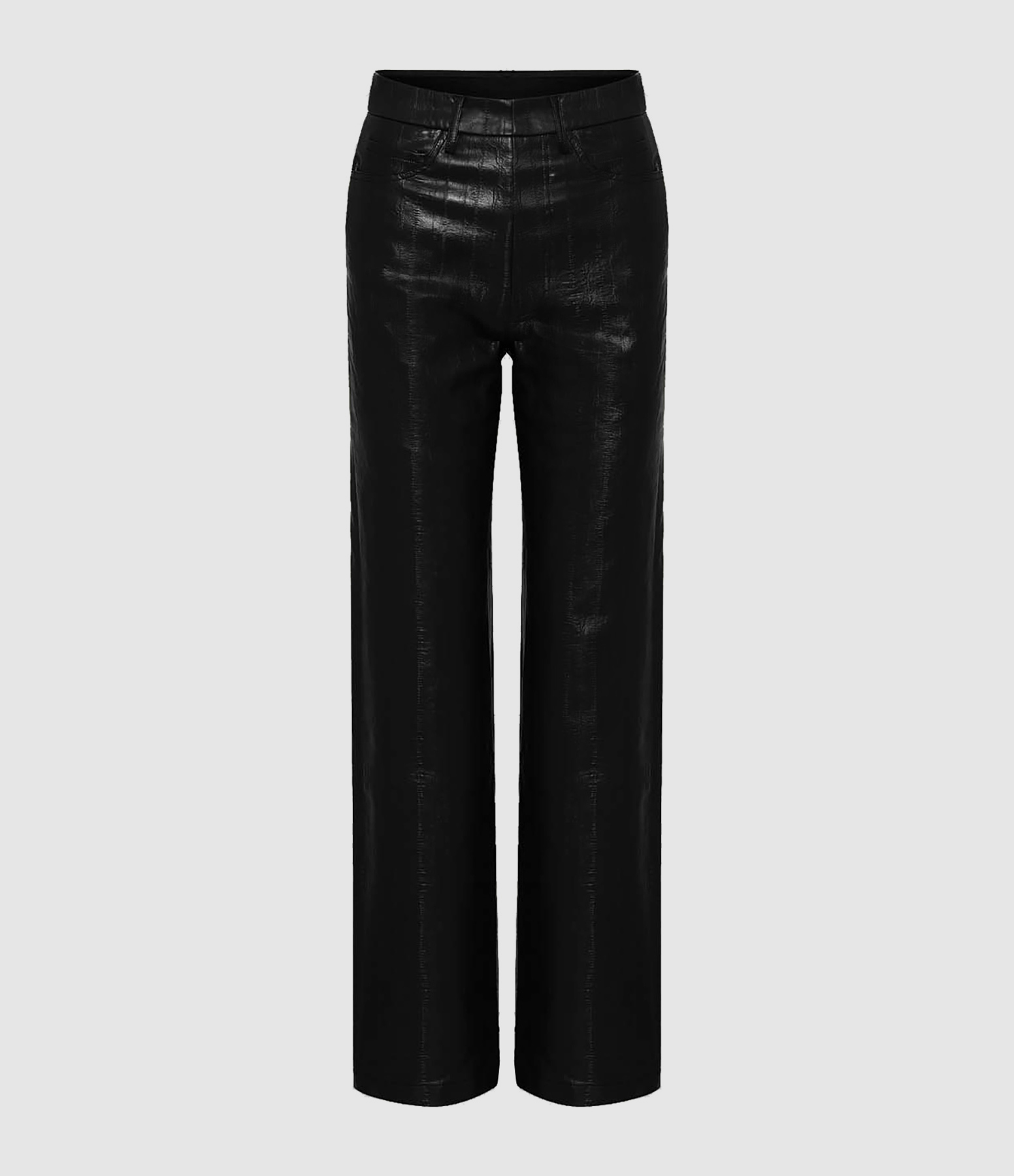 Pantalon en simili cuir enduit noir. Passants pour ceinture. Fermeture zippée sous la braguette et crochet sur le devant. Deux poches italiennes et une poche à gousset. Deux poches plaquées dans le dos. Coupe droite. Base droite.