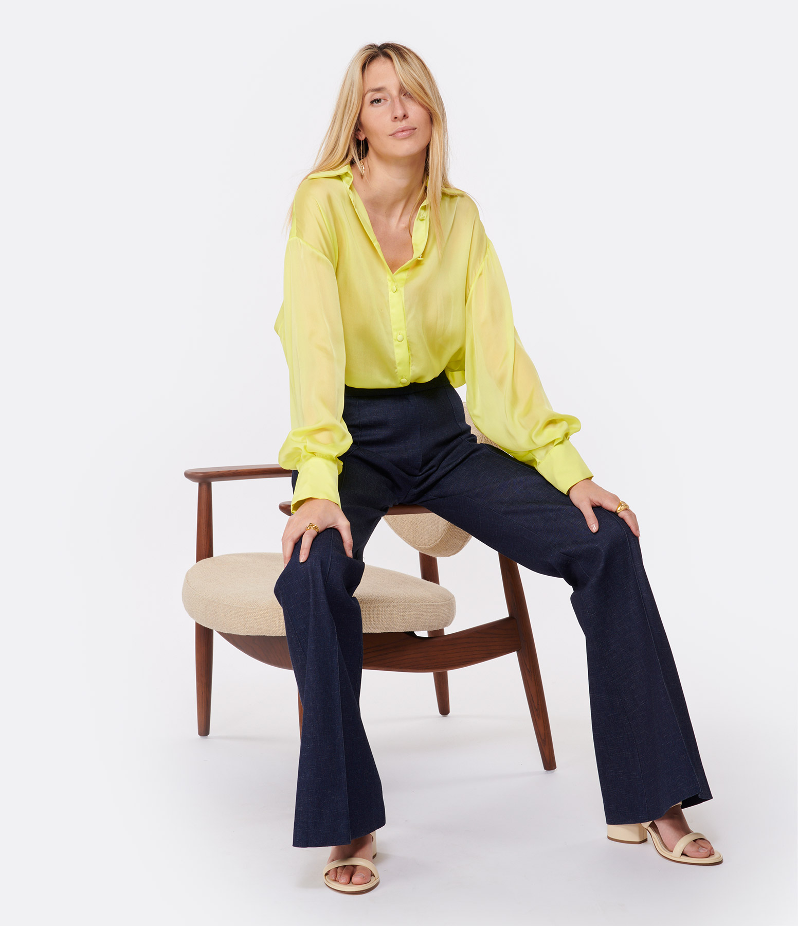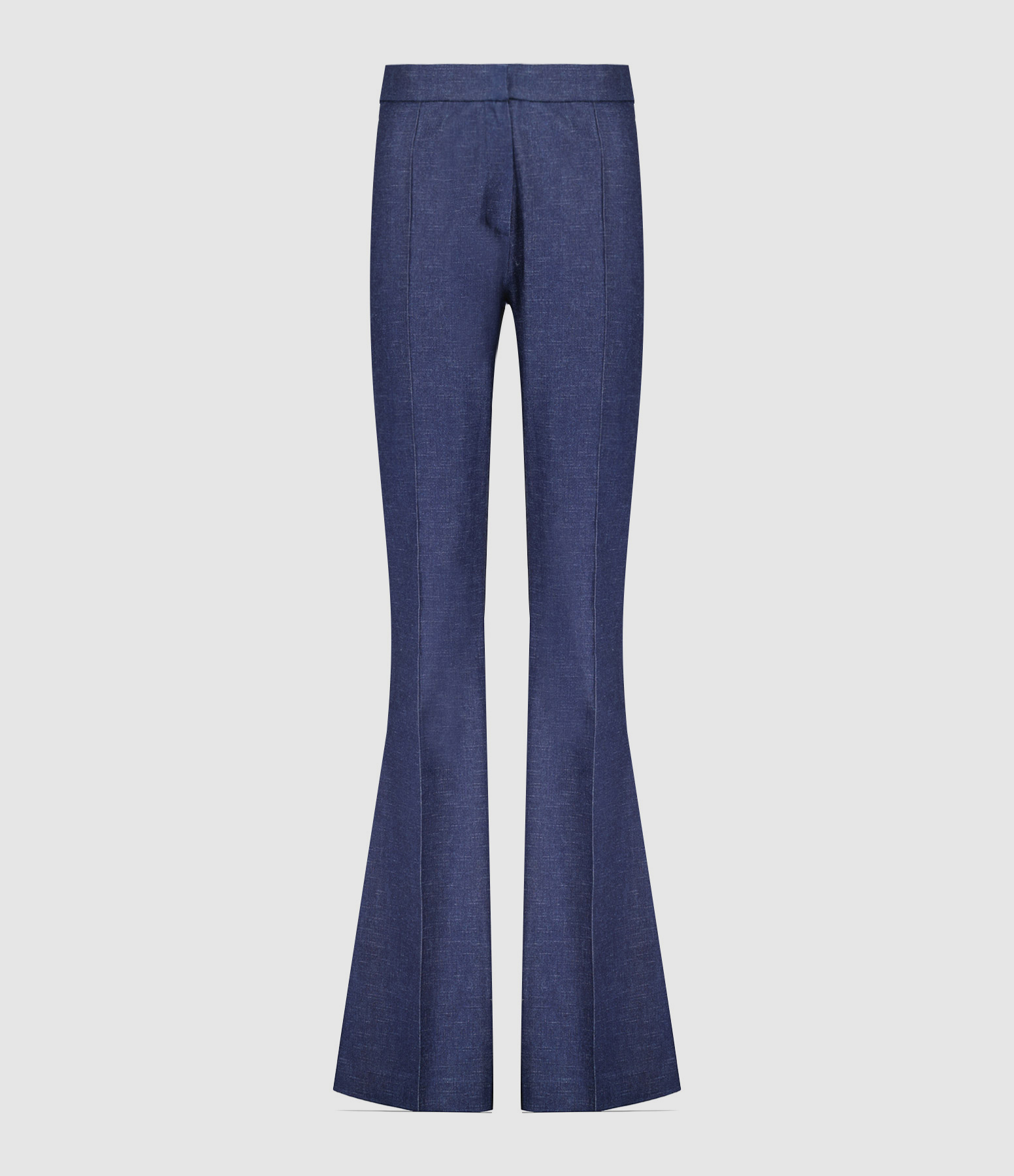 Pantalon à pinces en denim bleu foncé. Fermeture zippée et à crochet cachée sous la braguette sur le devant. Deux pinces sur le devant. Deux pinces dans le dos. Taille haute. Coupe évasée. Base droite. Non doublé.