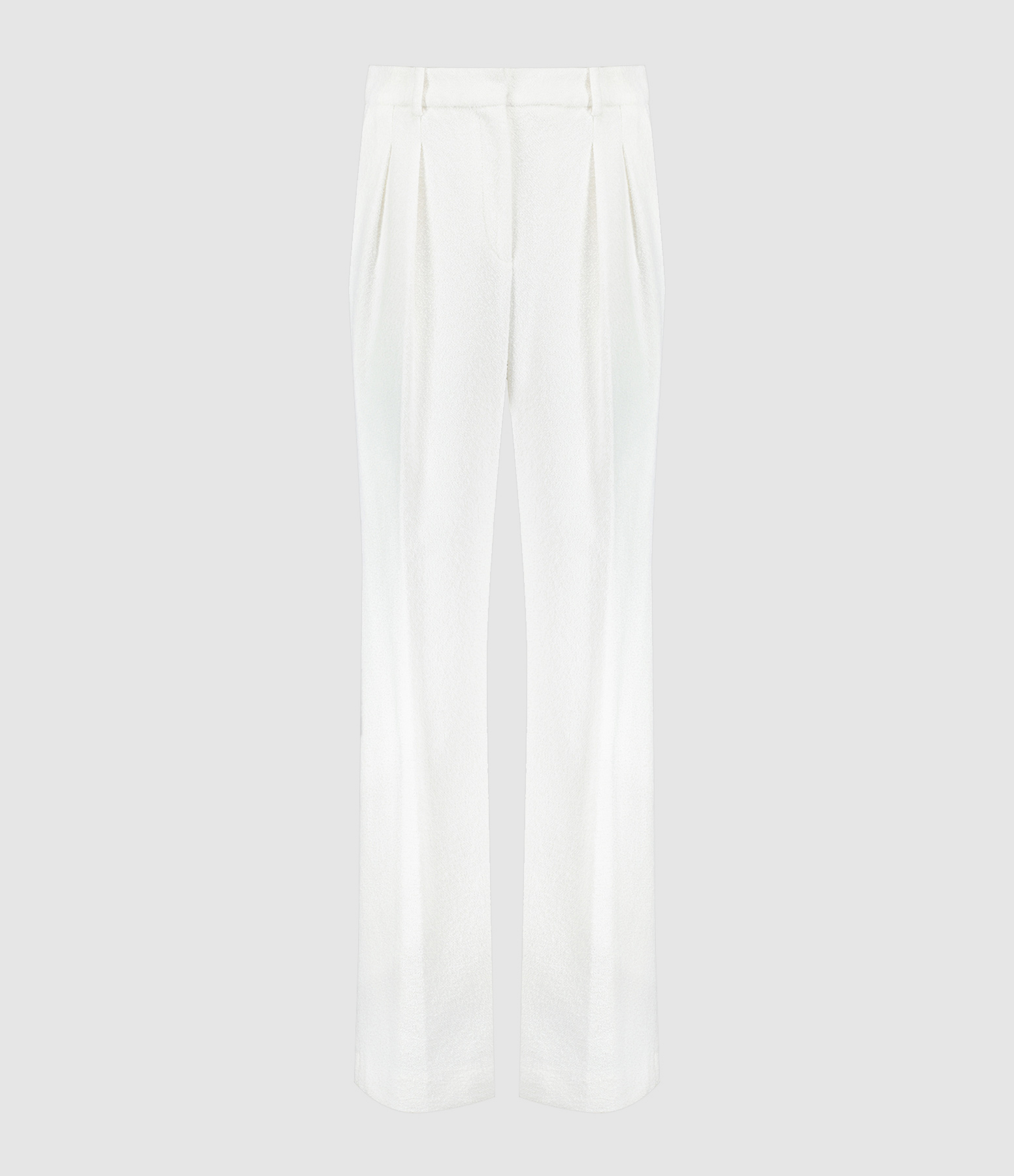 Pantalon tailleur à pinces en coton mélangé blanc. Passants pour ceinture. Braguette zippée et crochet. Deux poches italiennes. Deux poches italiennes. Deux poches passepoilées dans le dos. Coupe large. Base droite.