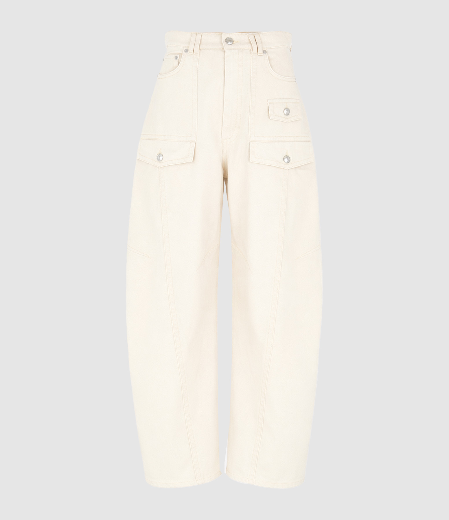 Pantalon à taille et entrejambe bas, caractérisé par de grandes poches d’inspiration utilitaire et une forme arrondie sur les jambes. Les boutons en métal ajoutent des détails à l’esprit décontracté. Motif de surpiqûres ton sur ton qui met en valeur les coupes de construction et les pinces.