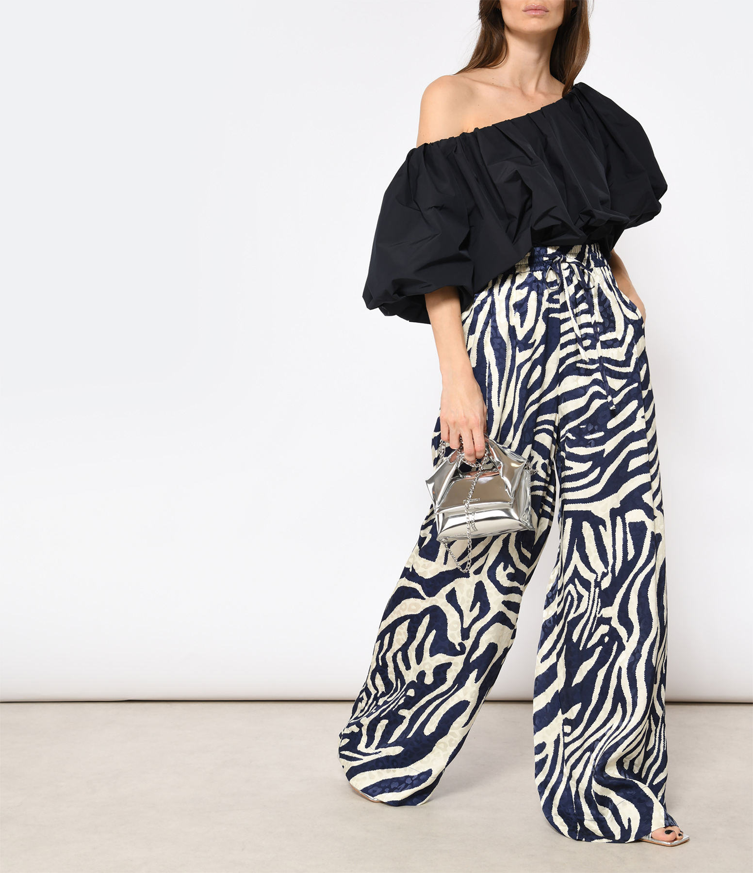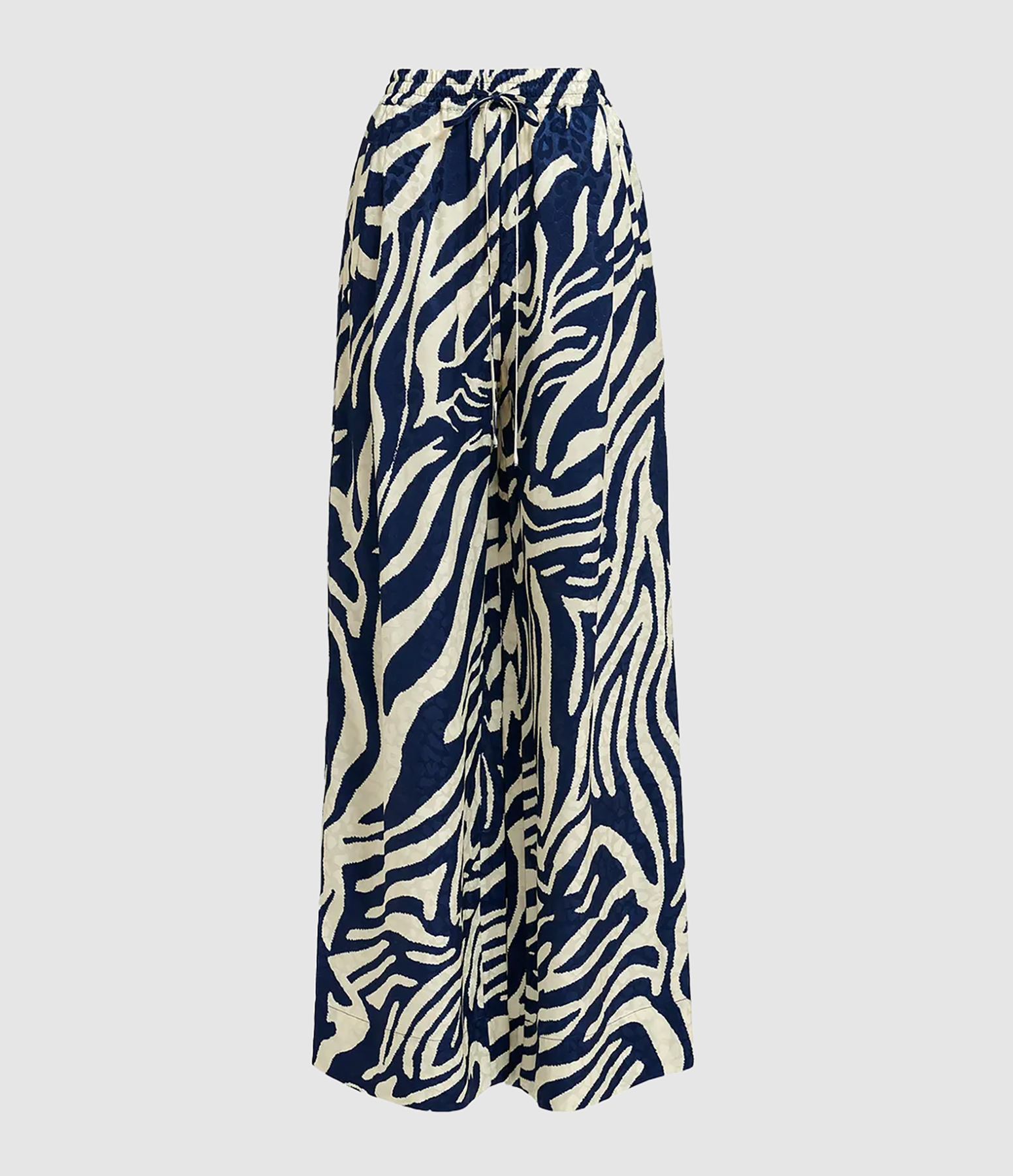 Pantalon à rayures bleues marines. Taille élastiquée avec liens à nouer. Deux poches. Coupe droite.