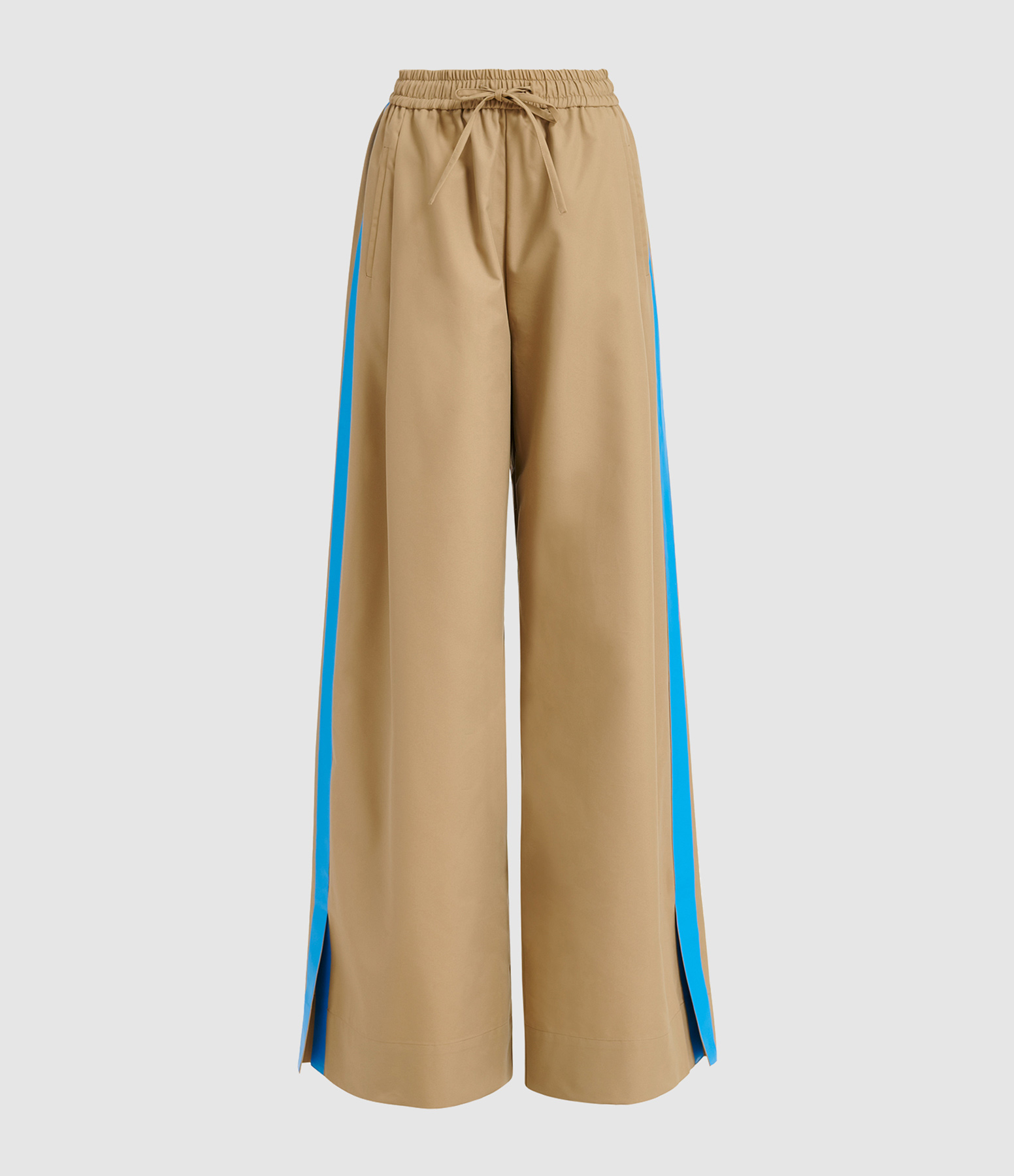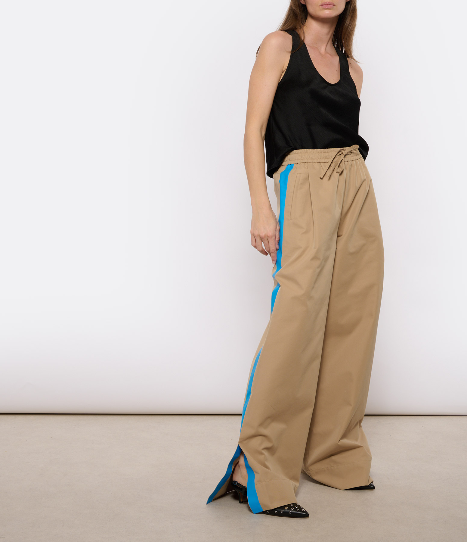 Pantalon en coton beige. Rayures bleu sur les côtés. Taille élastiquée avec cordon de serrage. Poches italiennes. Coupe droite. Base droite fendue sur les côtés.
