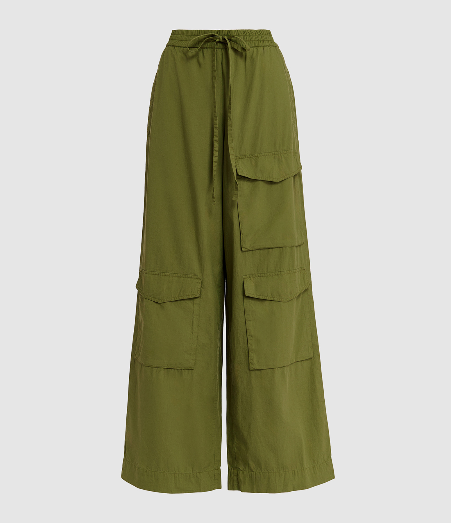 Pantalon fluide en coton kaki, effet treillis. Taille haute élastiquée avec liens à nouer. Jambes larges. Poches plaquées.