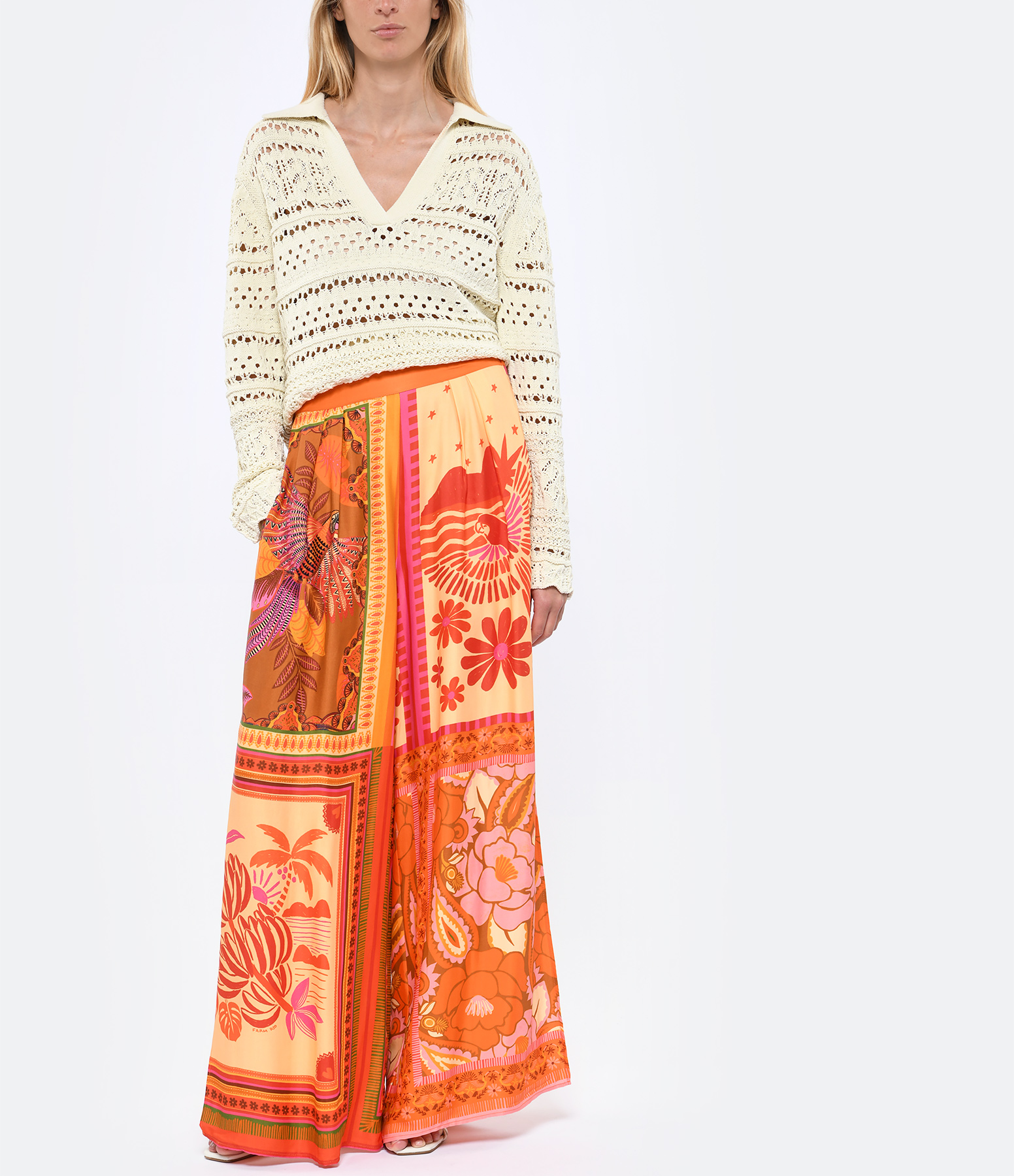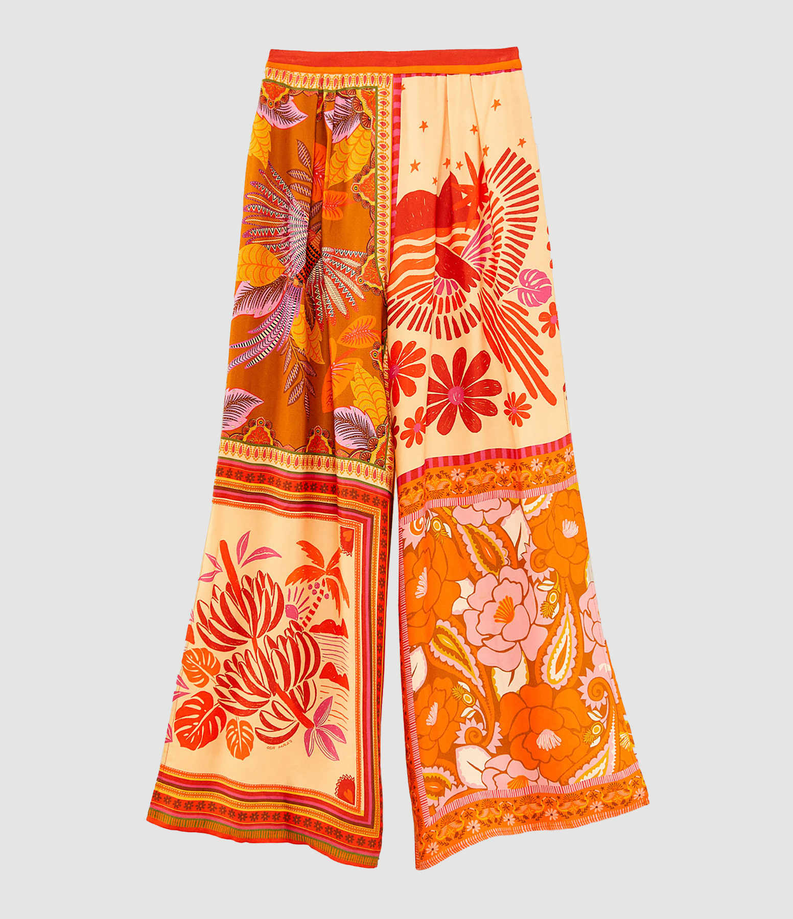 Pantalon large à imprimé multicolore. Taille élastiquée. Deux poches prises dans la couture sur le devant. Fentes au niveau des chevilles. Coupe large. Base droite.