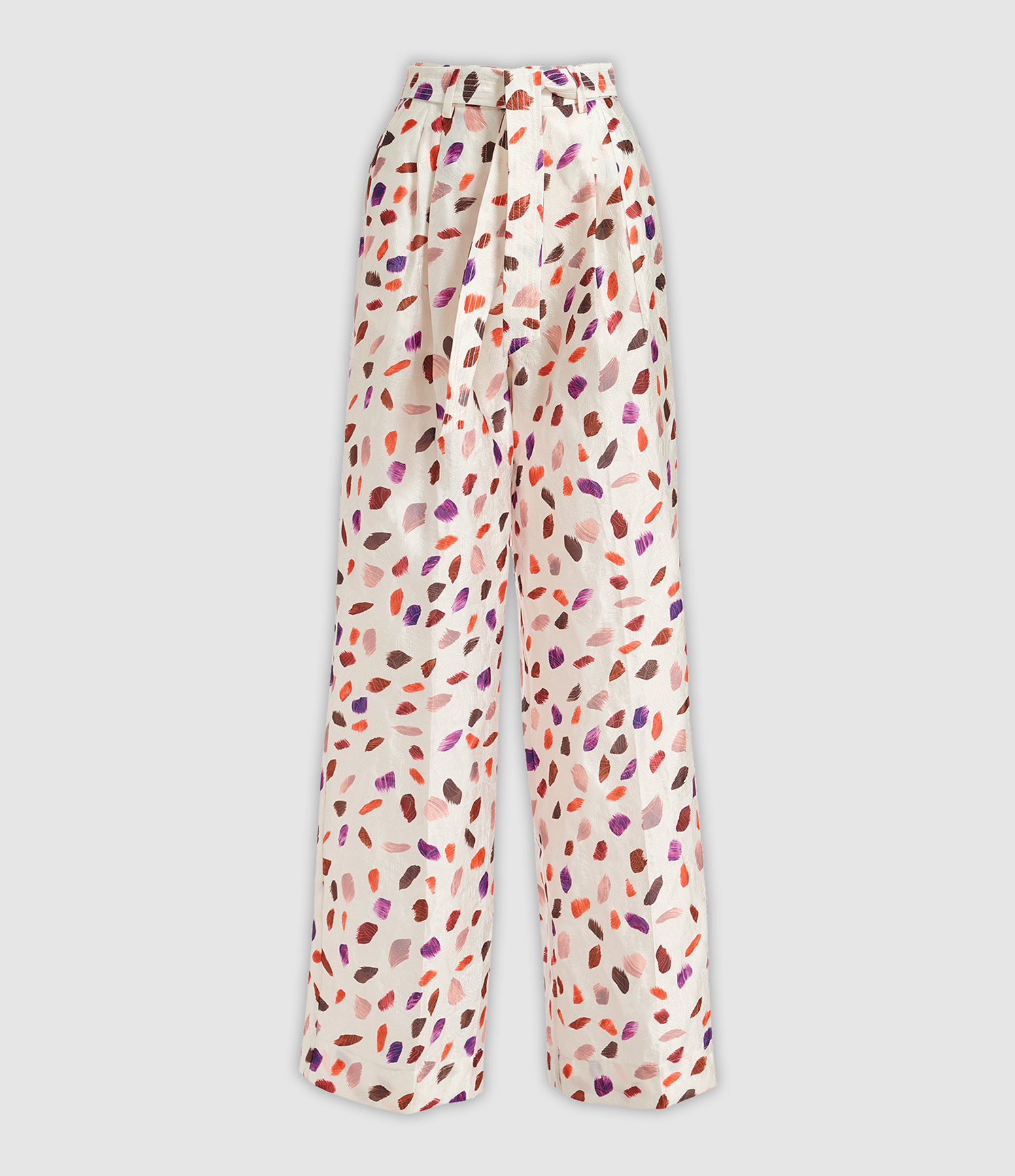 Pantalon en jacquard fleuri brillant. Taille haute. Jambes larges. Plis pressé à l'avant et à l'arrière. Poches italiennes. Fermeture par zip et ceinture à nouer.