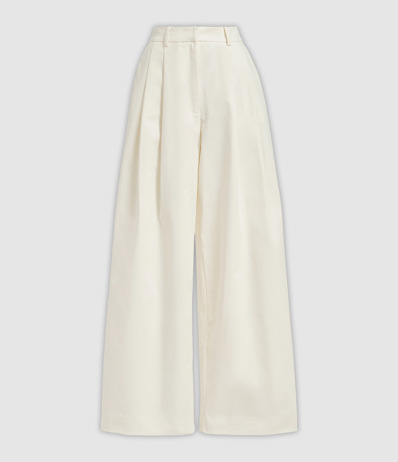 Pantalon beige avec plis au niveau de la taille. Coupe ample et confortable. Jambes larges et évasée. Taille haute. Poches italiennes et deux poches passepoilées à l'arrière. Fermeture zippée.