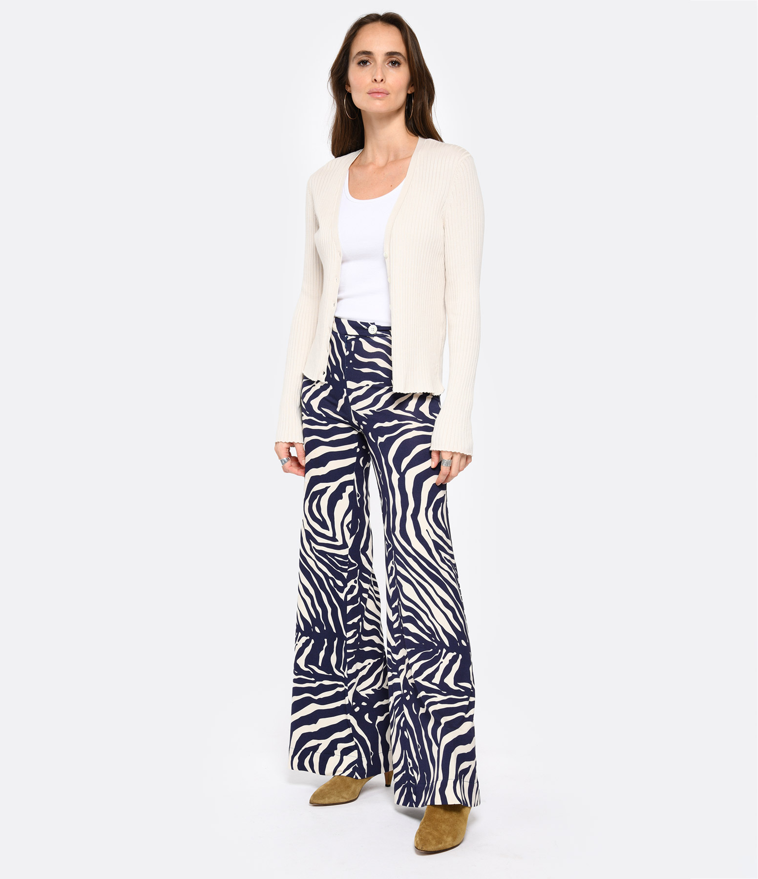 Pantalon fluide à imprimé zèbre bleu marine et blanc. Taille haute. Fermeture par zip et un bouton. Coupe large. Base droite.