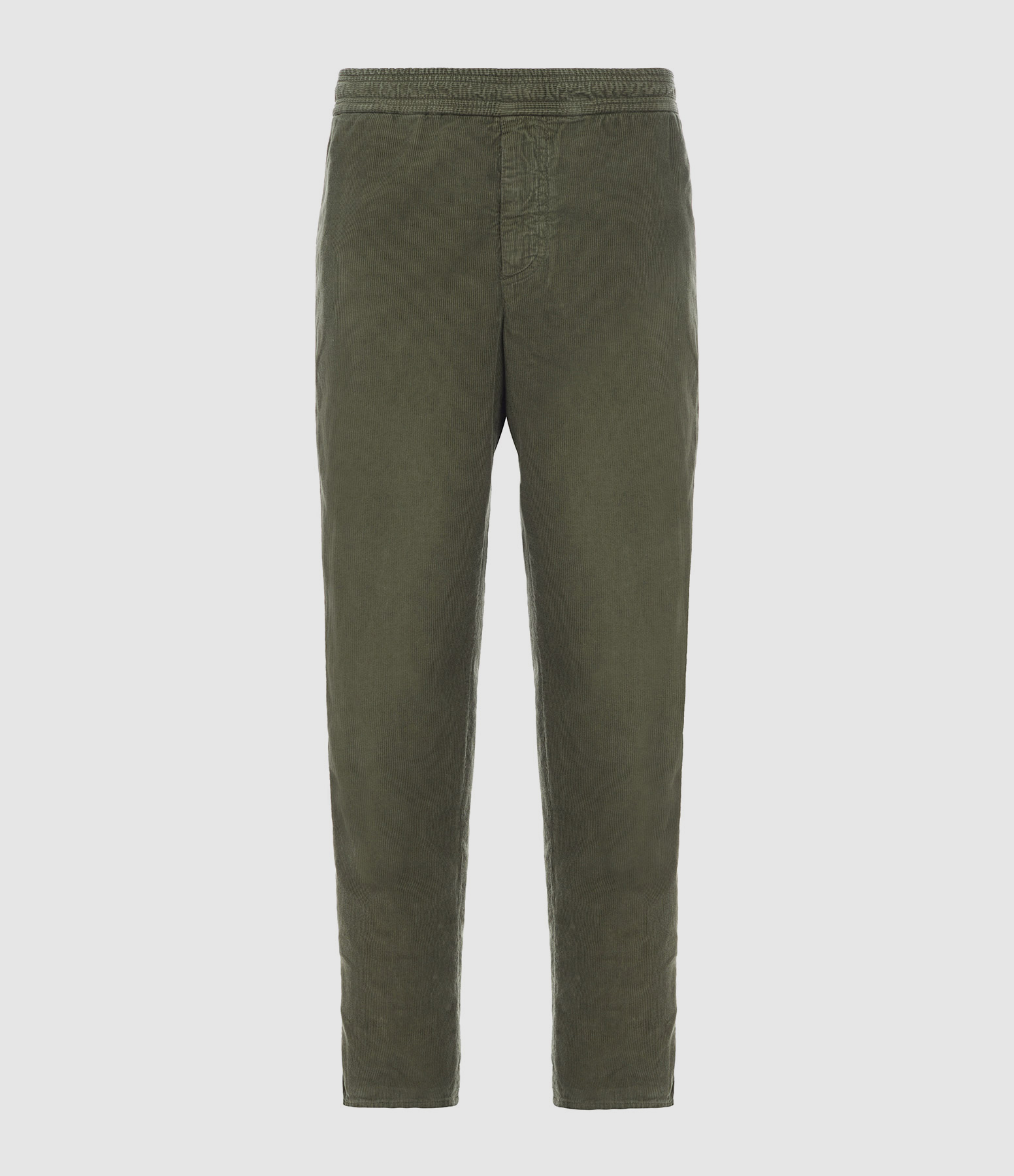Pantalon droit en coton kaki pour homme. Taille élastiquée avec liens de serrage. Deux poches italiennes et deux poches à rabats à l'arrière. Fermeture par zip. Coupe droite.