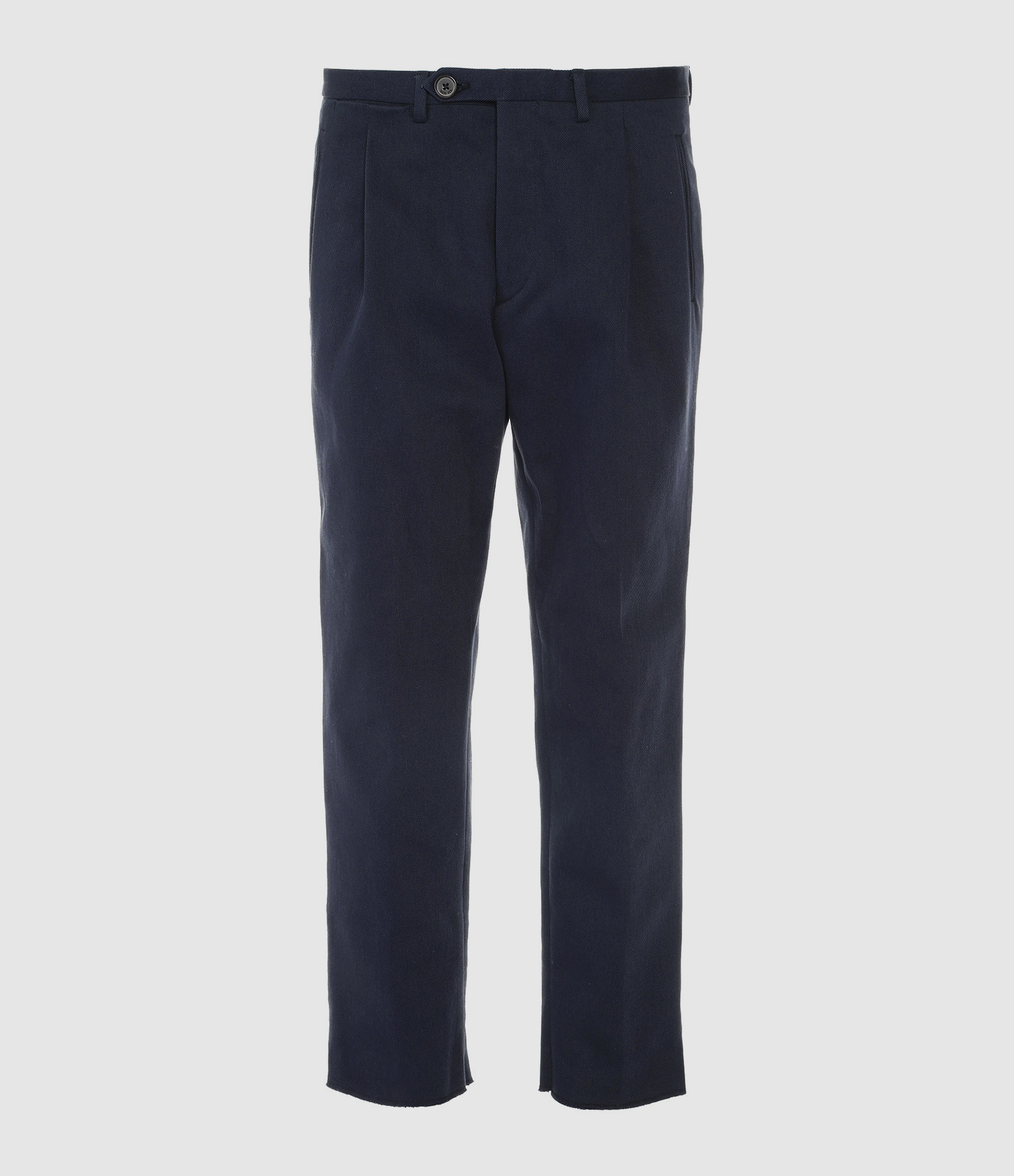 Pantalon à pinces en coton. Fermeture par plusieurs boutons. Deux poches passepoilées à l'avant et deux poches plaquées boutonnées à l'arrière. Non doublé.