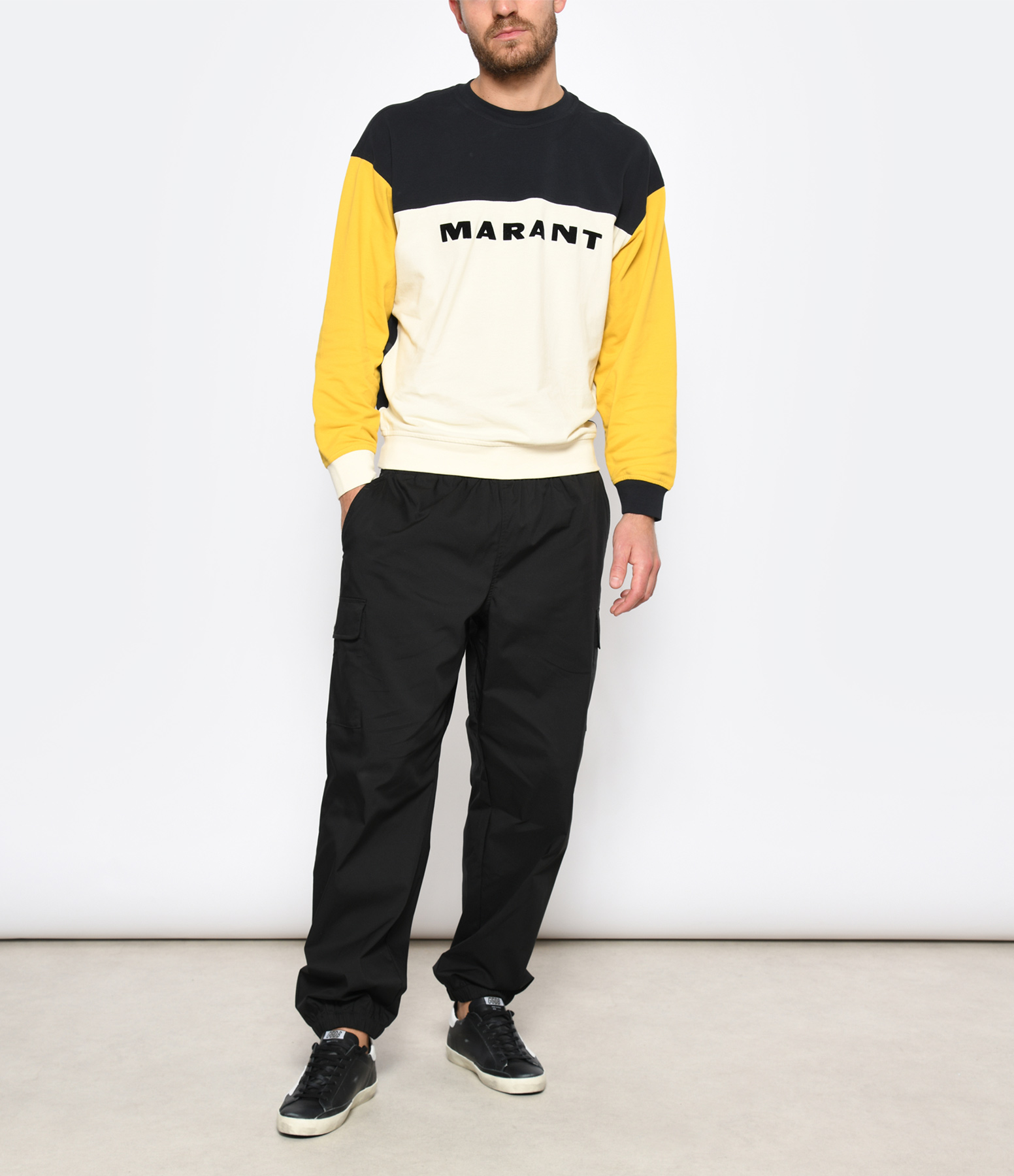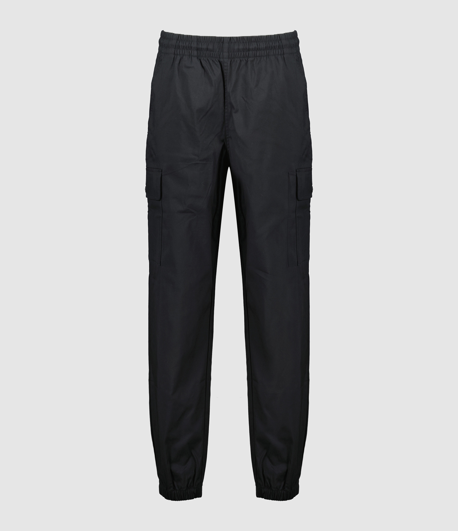 Pantalon pour homme style cargo en coton mélangé noir. Taille élastiquée avec cordon de serrage intérieures. Trois poches. Deux poches à rabat latérales au niveau des cuisses. Coupe droite. Base droite élastiquée resserrée.