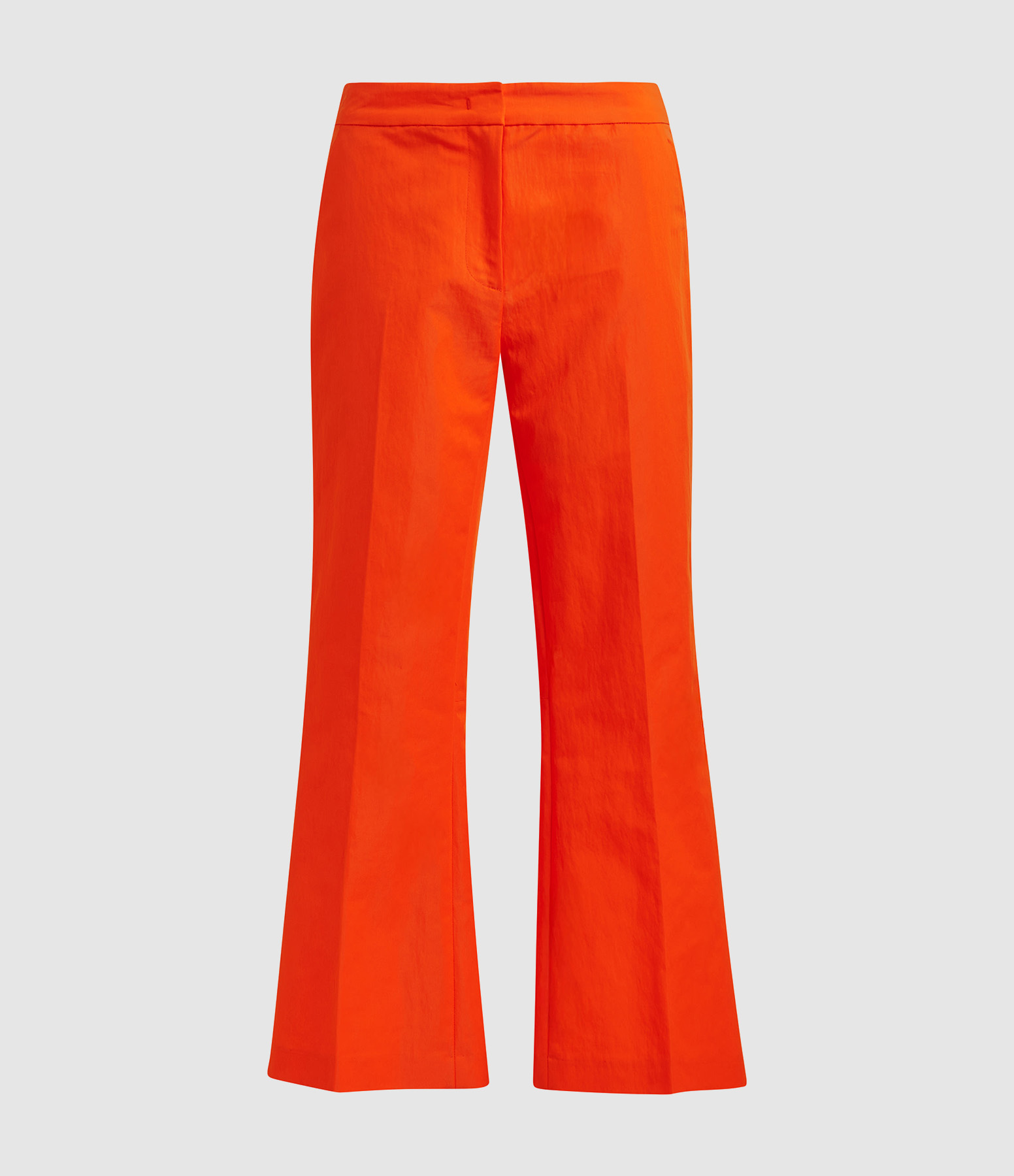 Pantalon court évasé orange. Poches italiennes. Pli pressé à l'avant et à l'arrière. Fermeture éclair et à agrafe.