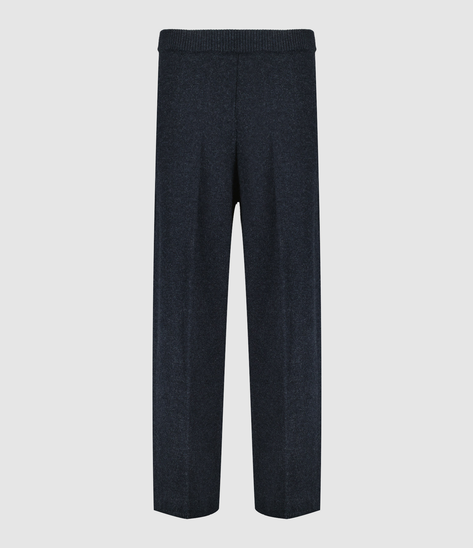 Pantalon en maille de laine mélangée gris foncé. Taille côtelée et élastiquée. Coupe large. Longueur raccourcie. Base droite côtelée.