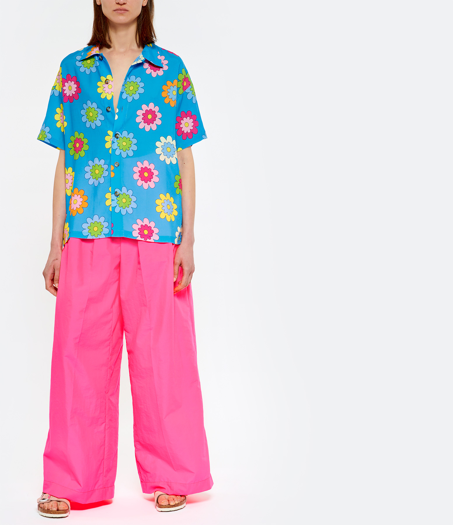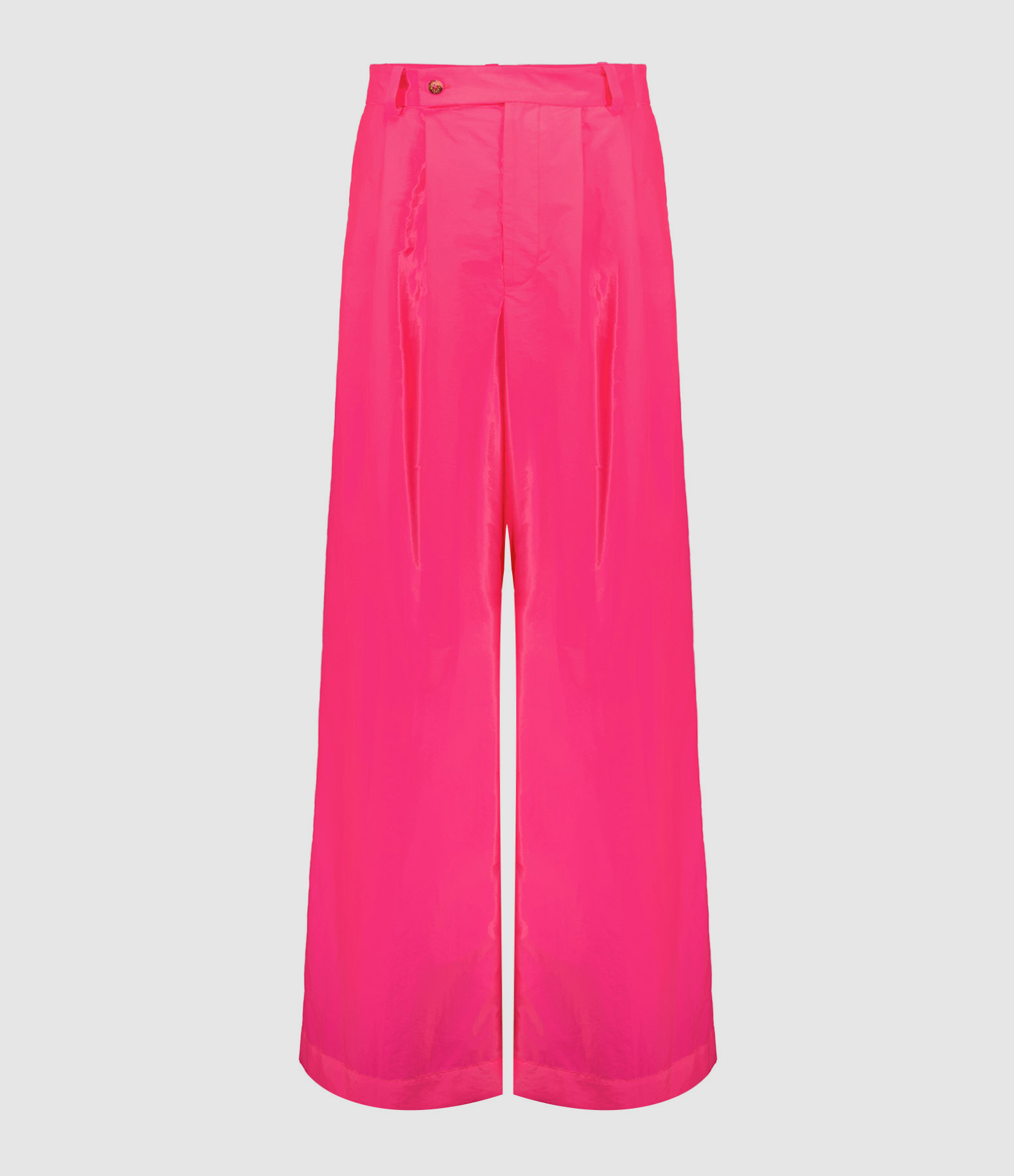 Pantalon à pinces rose fluo. Deux poches italiennes à l'avant et deux poches passepoilées à l'arrière. Fermeture par boutons et zip. Coupe large. Taille haute.