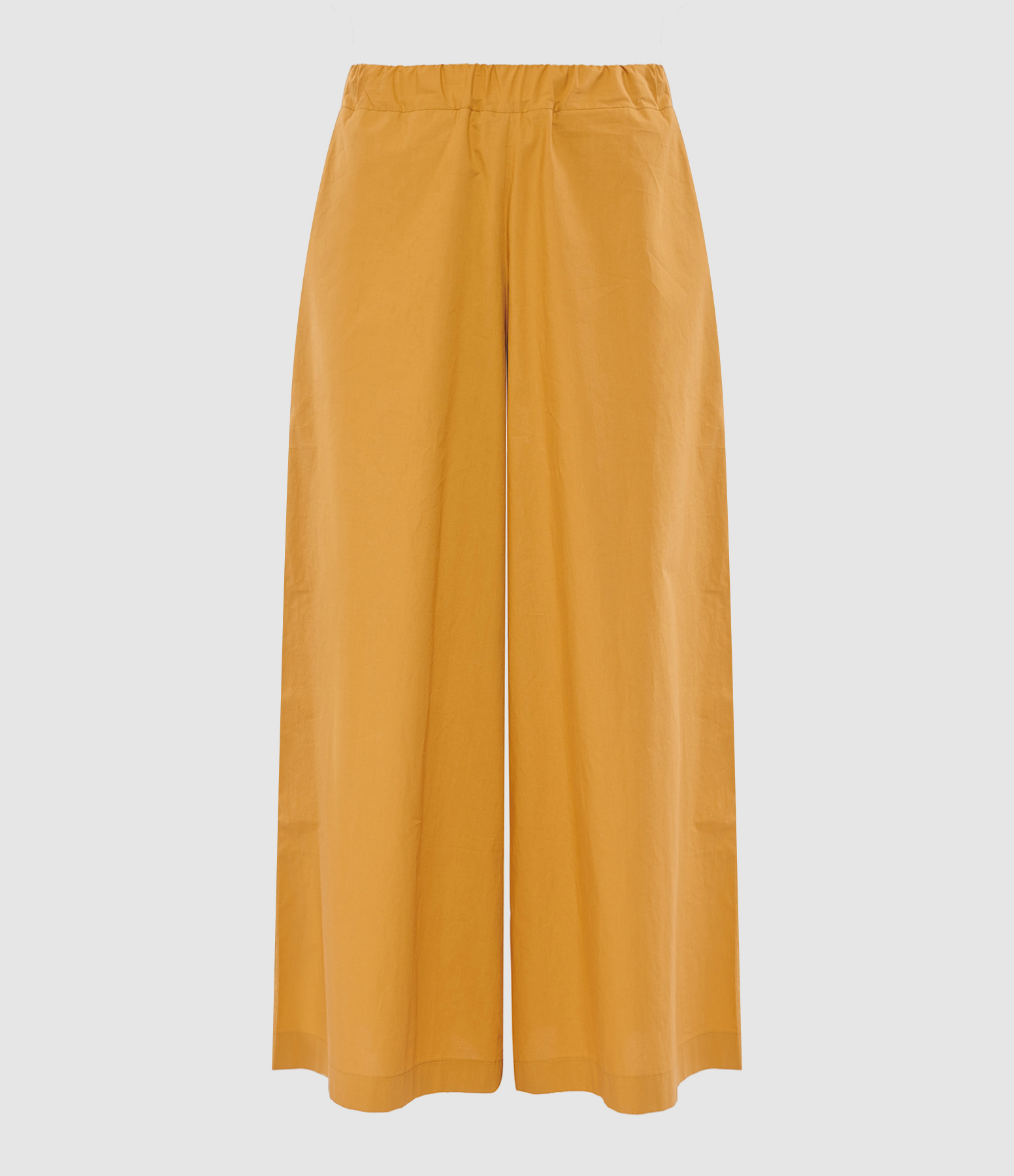 Pantalon large en coton moutarde. Taille élastiquée. Deux poches italiennes. Coupe large.