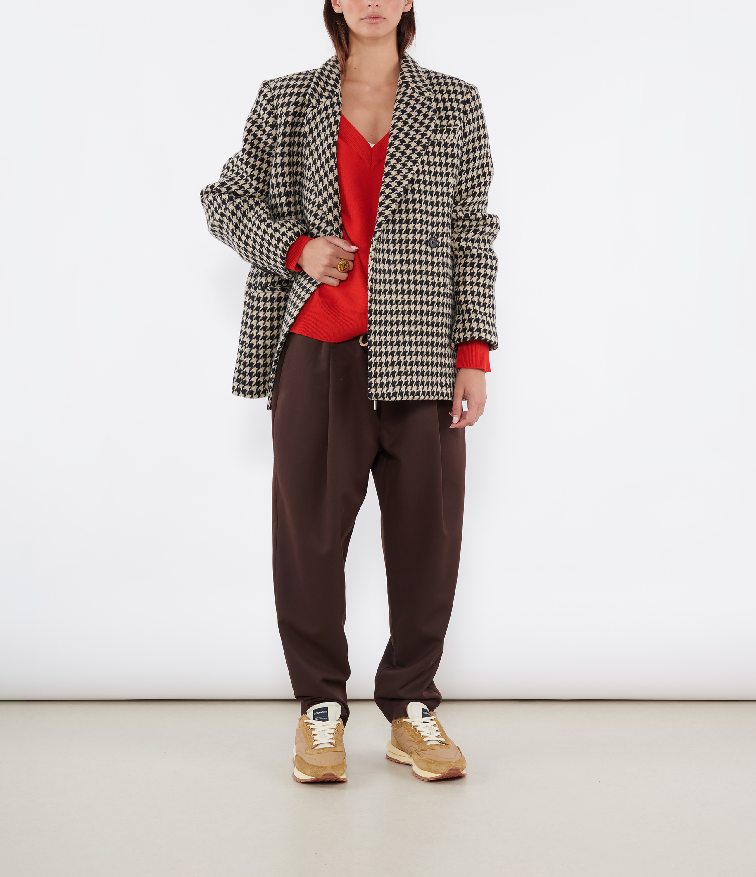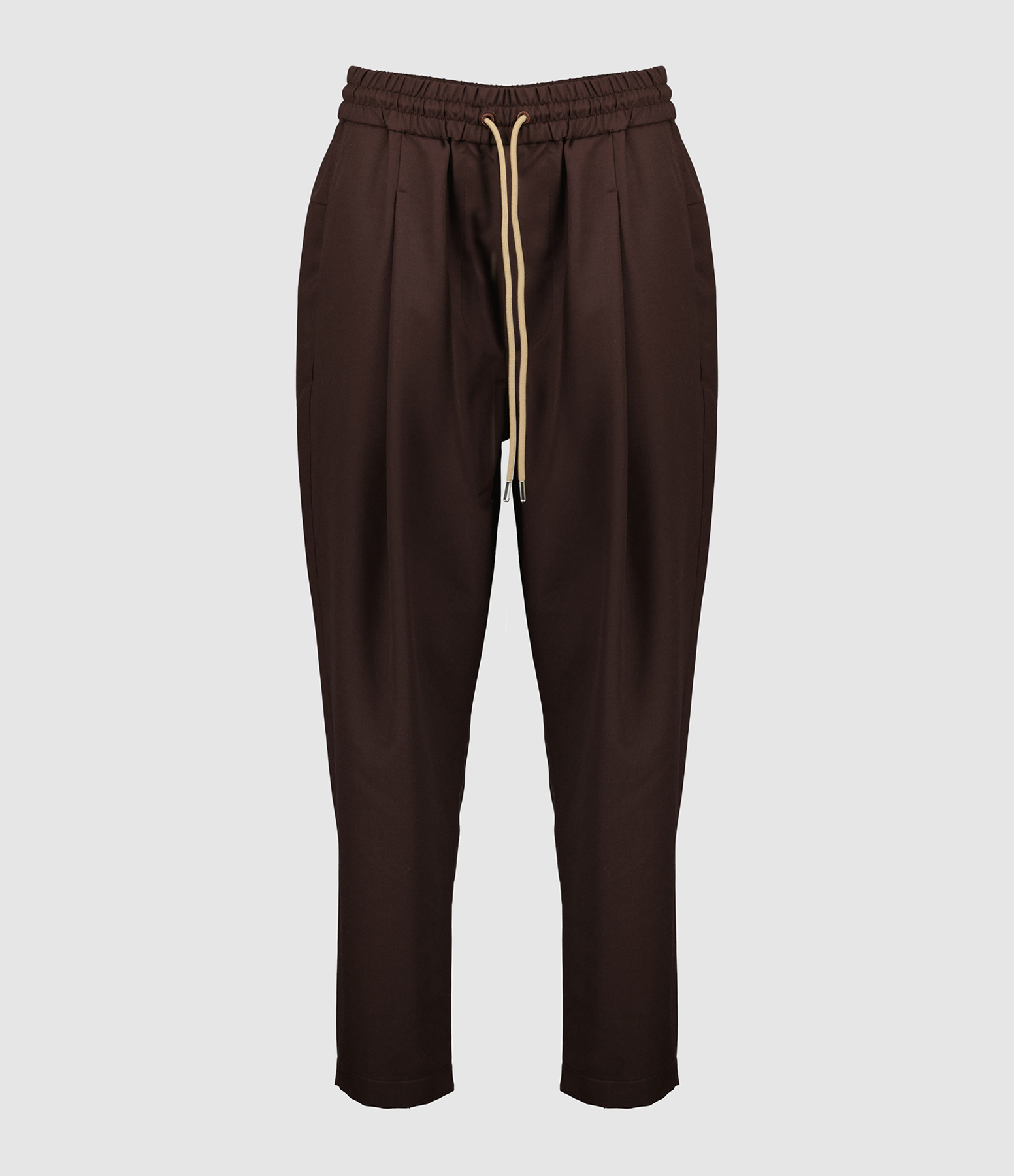 Pantalon en laine mélangée marron. Taille élastiquée avec cordons de serrage dorés. Deux poches italiennes sur le devant et deux poches boutonnées dans le dos. Coupe droite. Base droite.