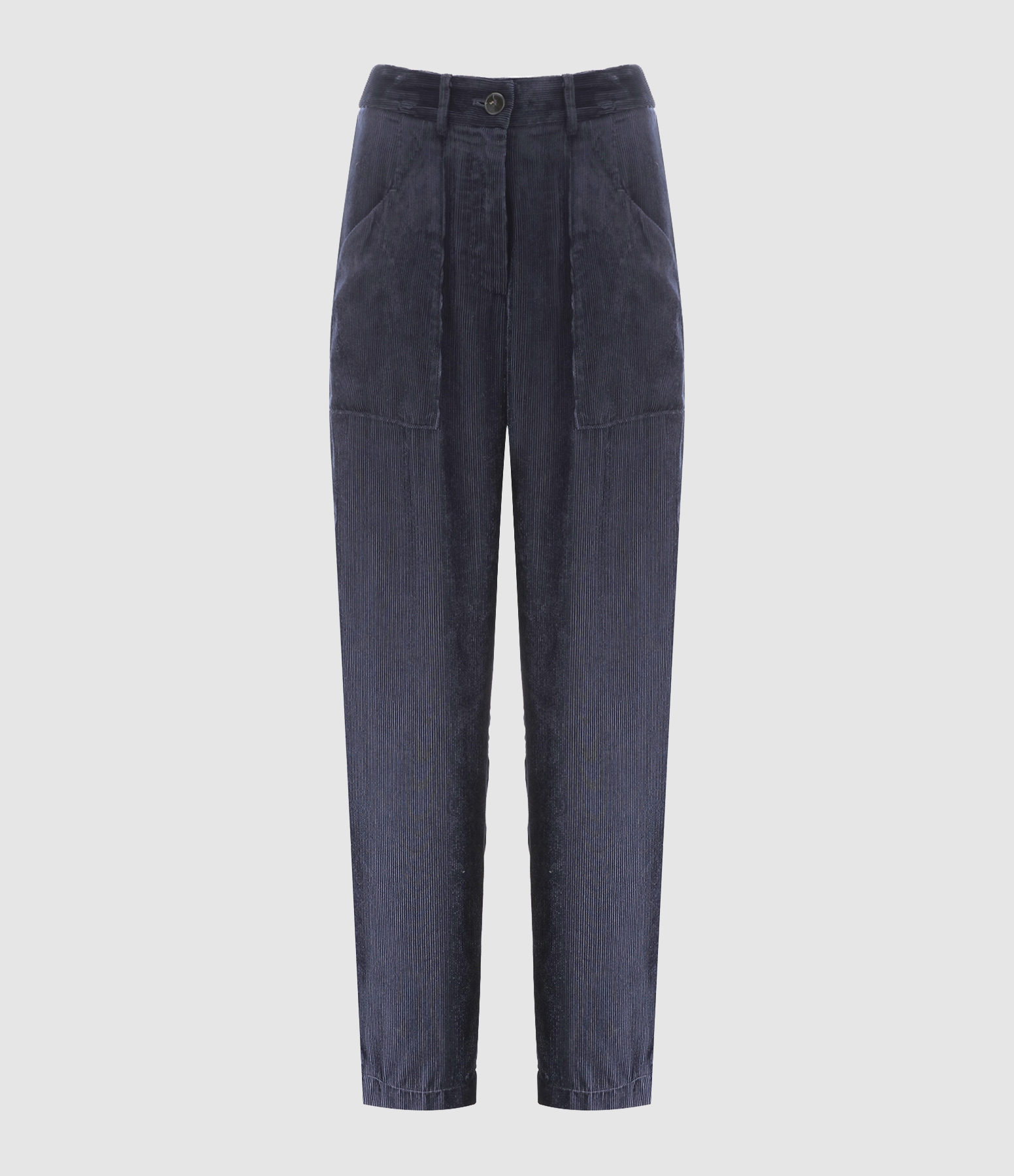 Pantalon en velours côtelés bleu marine. Deux poches à l'avant. Fermeture par boutons et zip. Coupe droite. Base droite.
