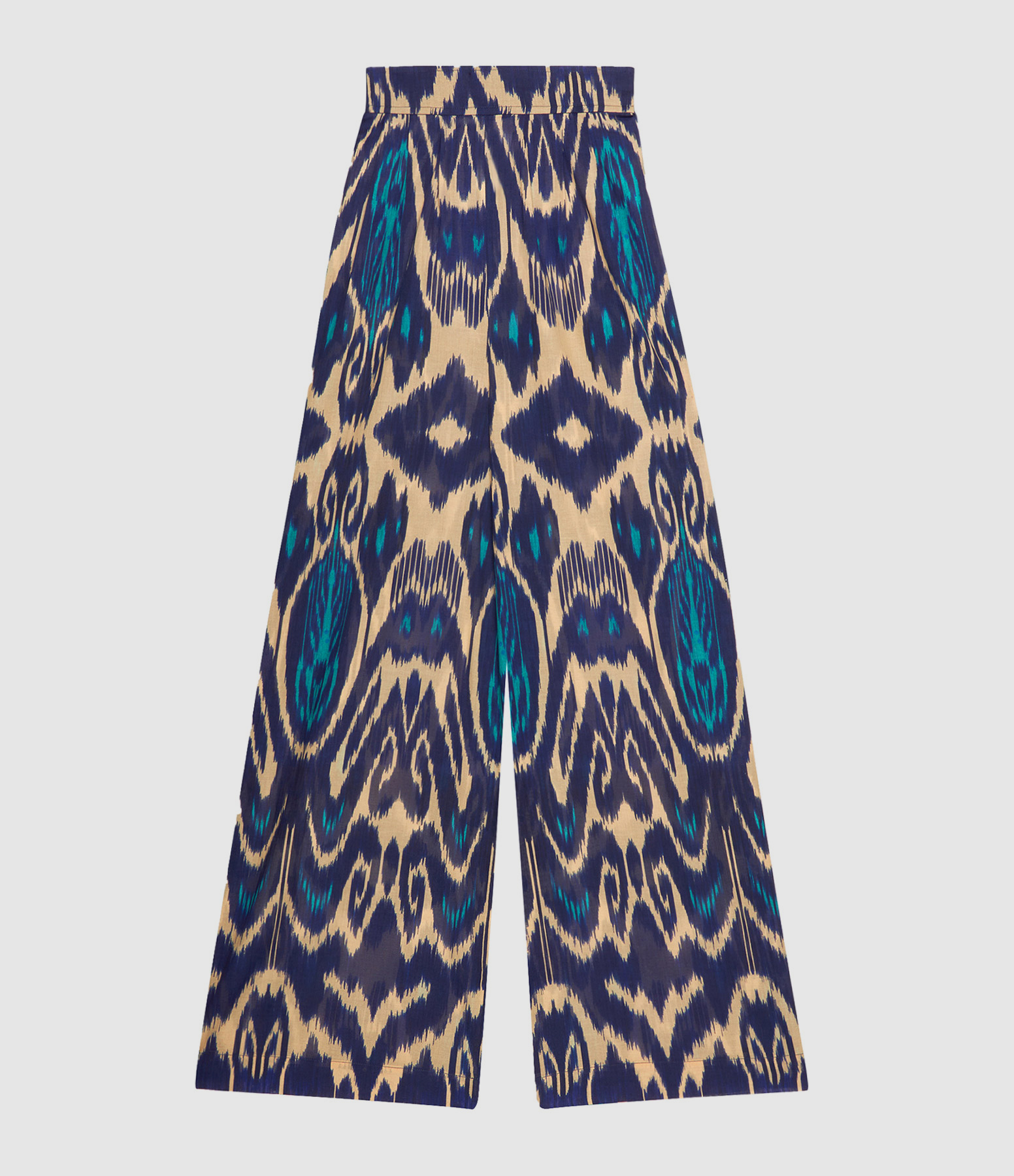 Pantalon large à imprimé bleu. Taille élastiquée. Deux poches sur les côtés. Coupe évasée. Base droite. Non doublé.