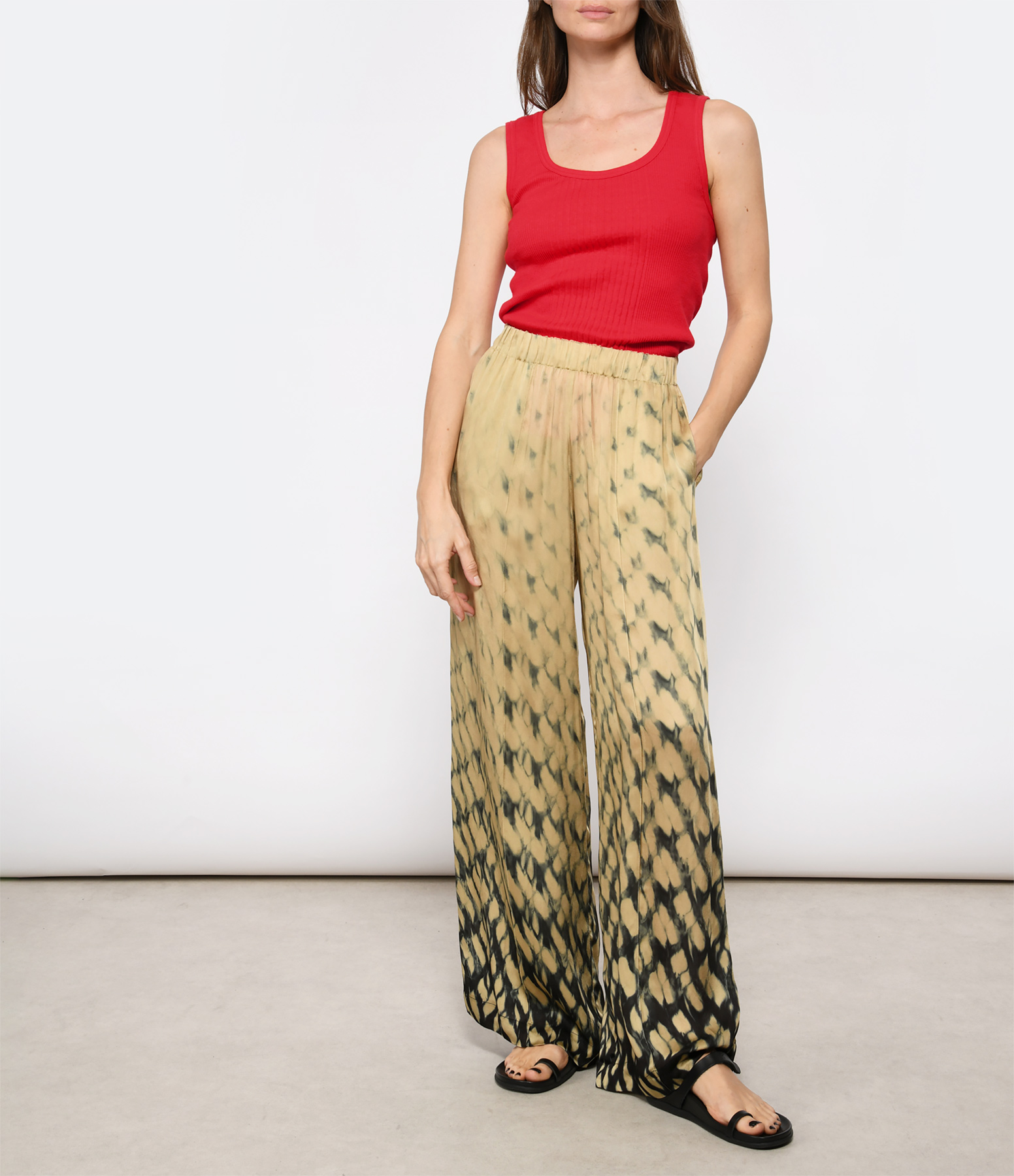 Pantalon en soie, imprimé beige et noir. Taille élastiquée. Poches italiennes. Coupe large.