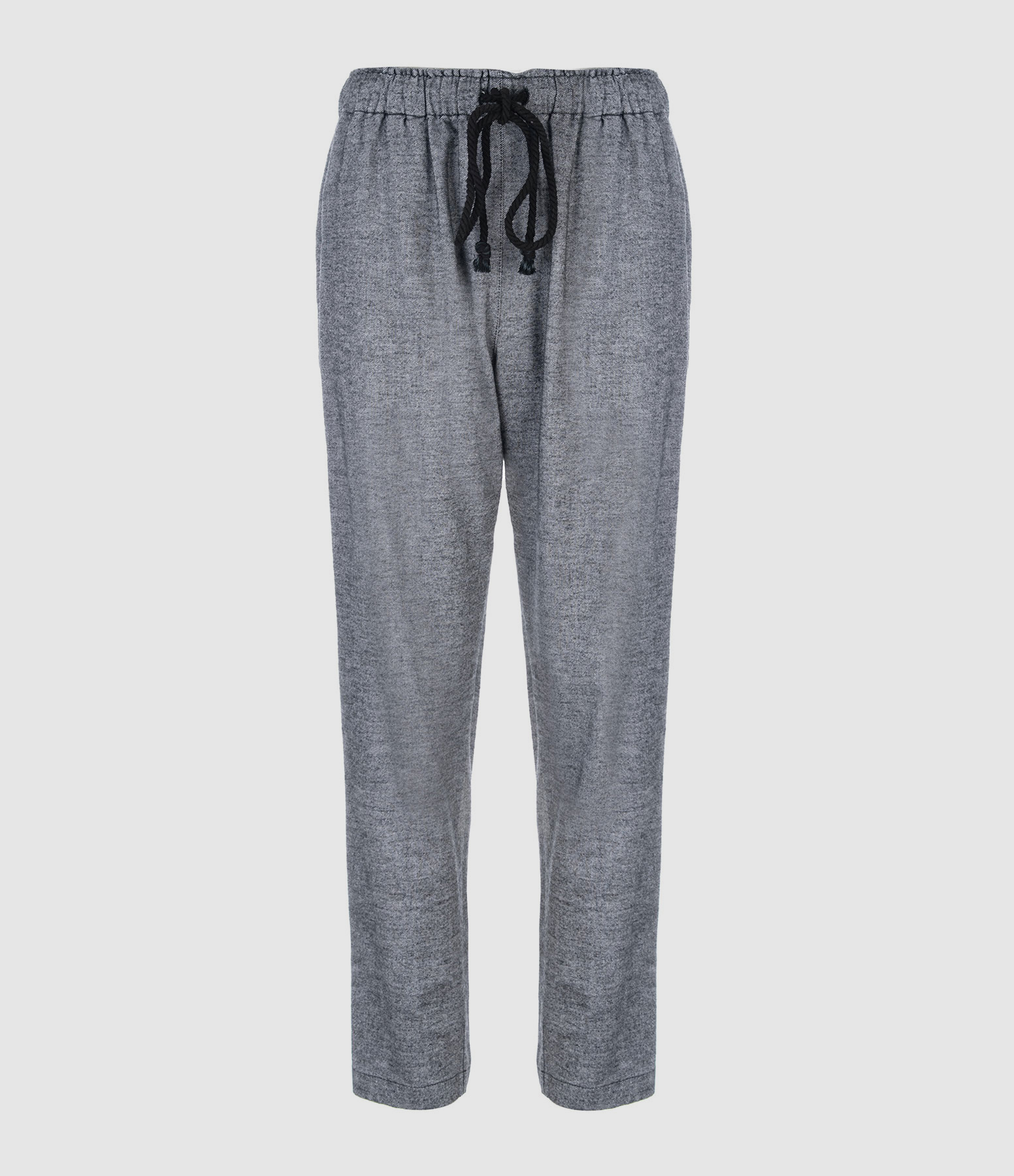 Pantalon en coton gris chiné. Taille élastiquée avec liens de serrage. Deux poches fendues à l'avant et une poche plaquée à l'arrière. Coupe droite.