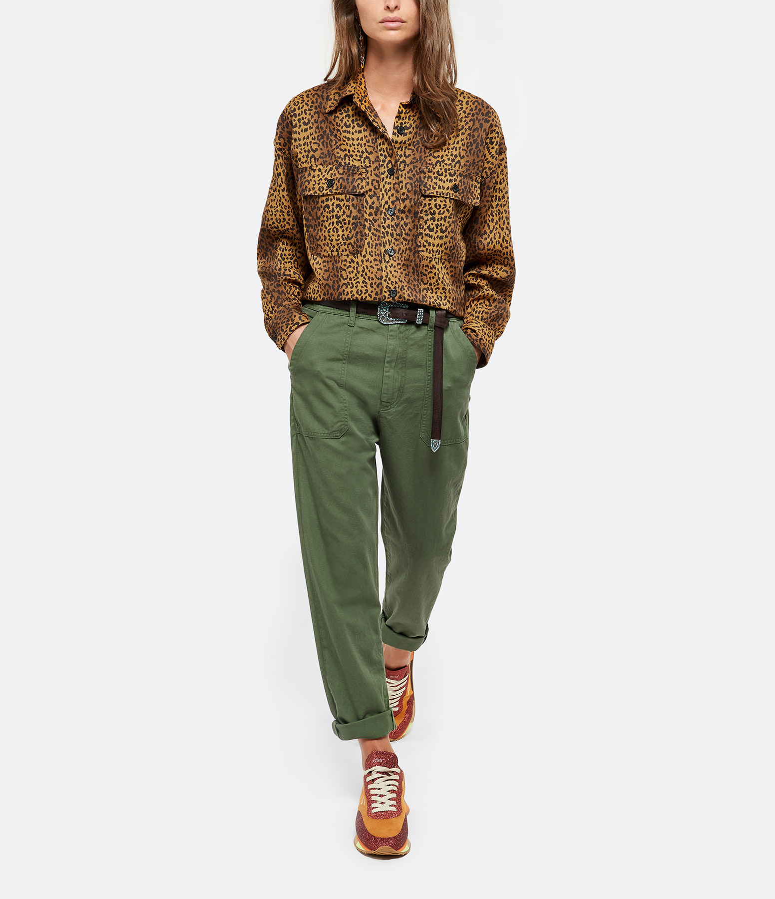 Pantalon en coton kaki. Quatre poches. Fermeture par zip. Coupe droite.