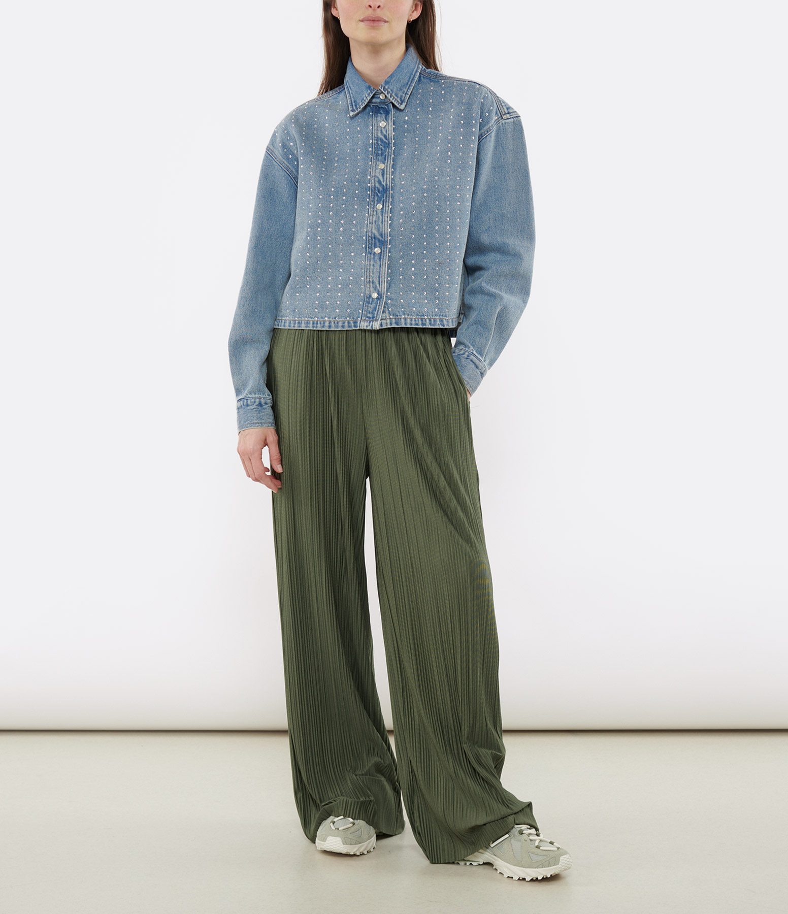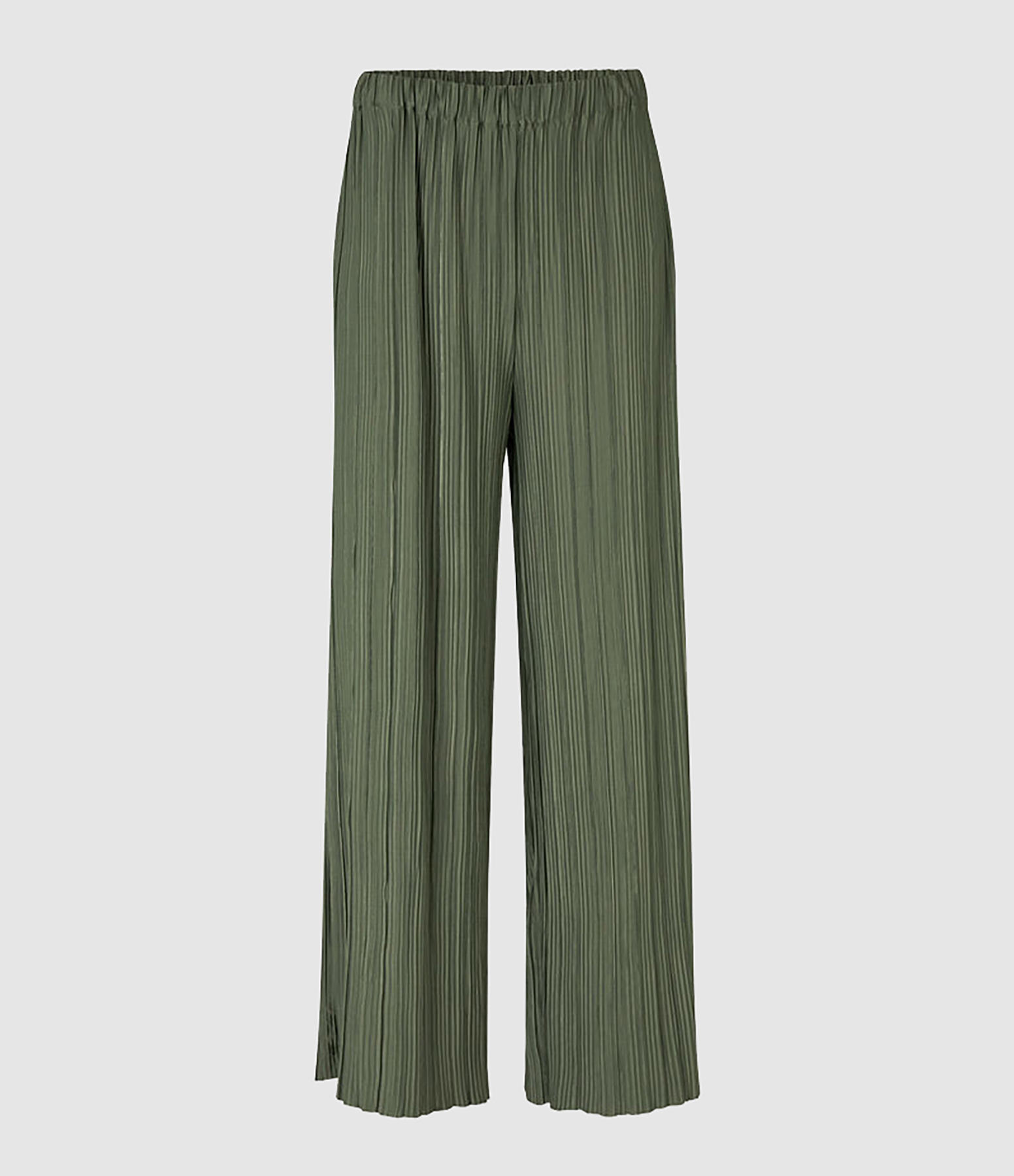 Pantalon en jersey kaki finement plissé. Taille élastiquée. Poches latérales fendues. Coupe ample. Base droite.