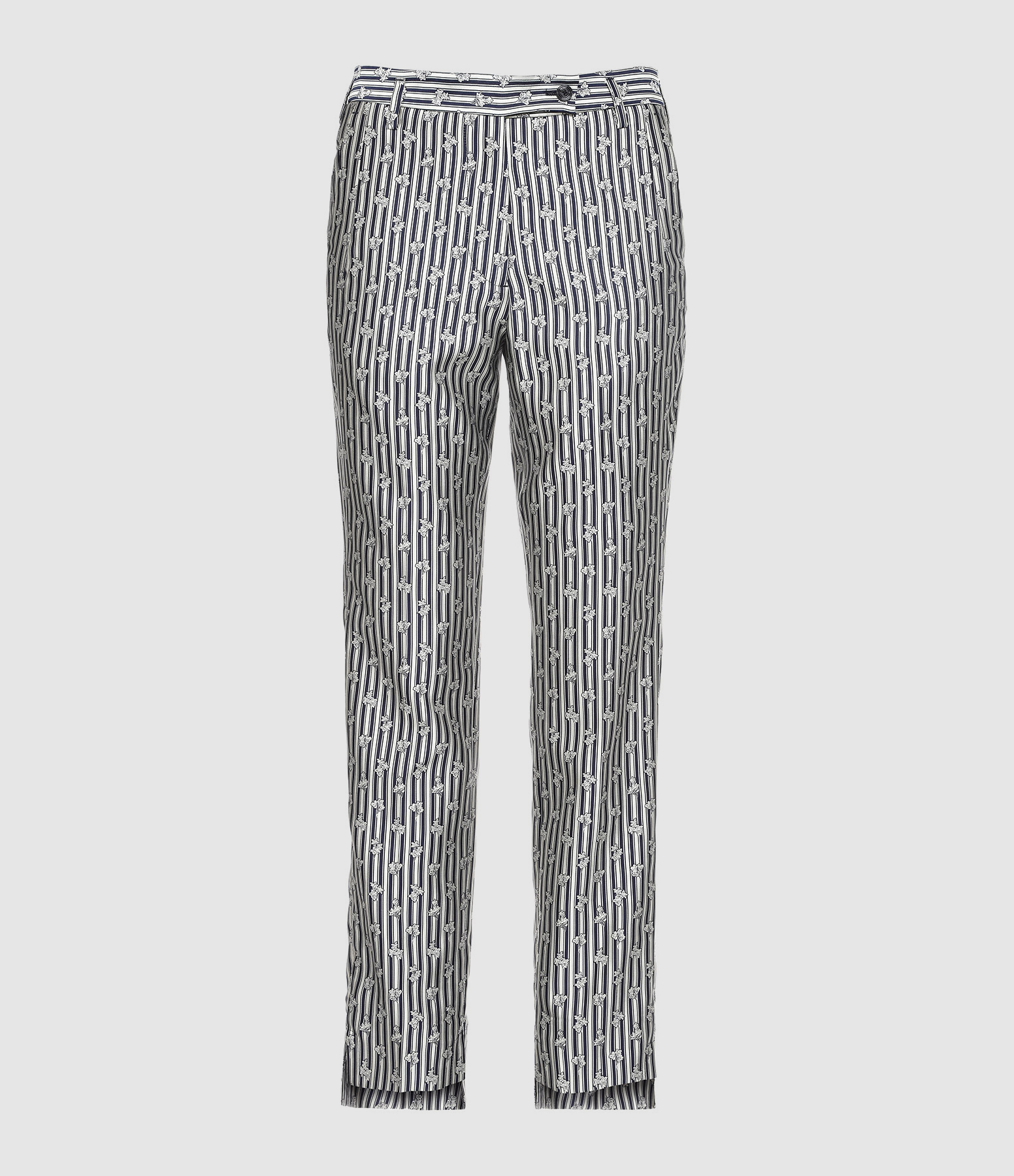 Pantalon droit à rayures fleurs navy, pour femme. Fermeture par un zip et un bouton. Deux poches italiennes, une poche passepoilée et une à rabat à l'arrière. Revers boutonné en bas de jambe permettant de rallonger le pantalon, plus long a l'arrière qu'à l'avant.