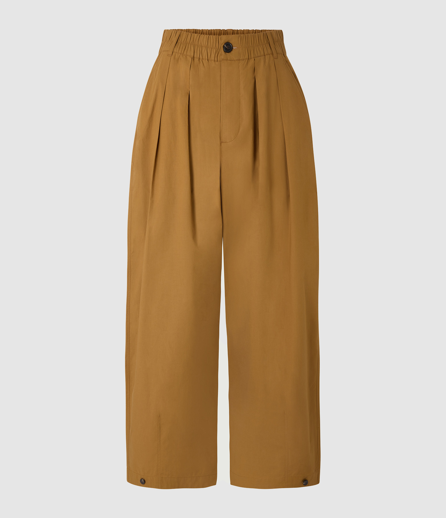 Pantalon élastiqué en popeline de coton légère marron. Base droite. Taille élastiquée. Ouverture boutonnée et zippée devant. Deux poches côtés et deux poches dos passepoilées. Pinces devant et dos. Coupe ample, arrondie et légèrement étroite en bas de jambe. Base droite.
