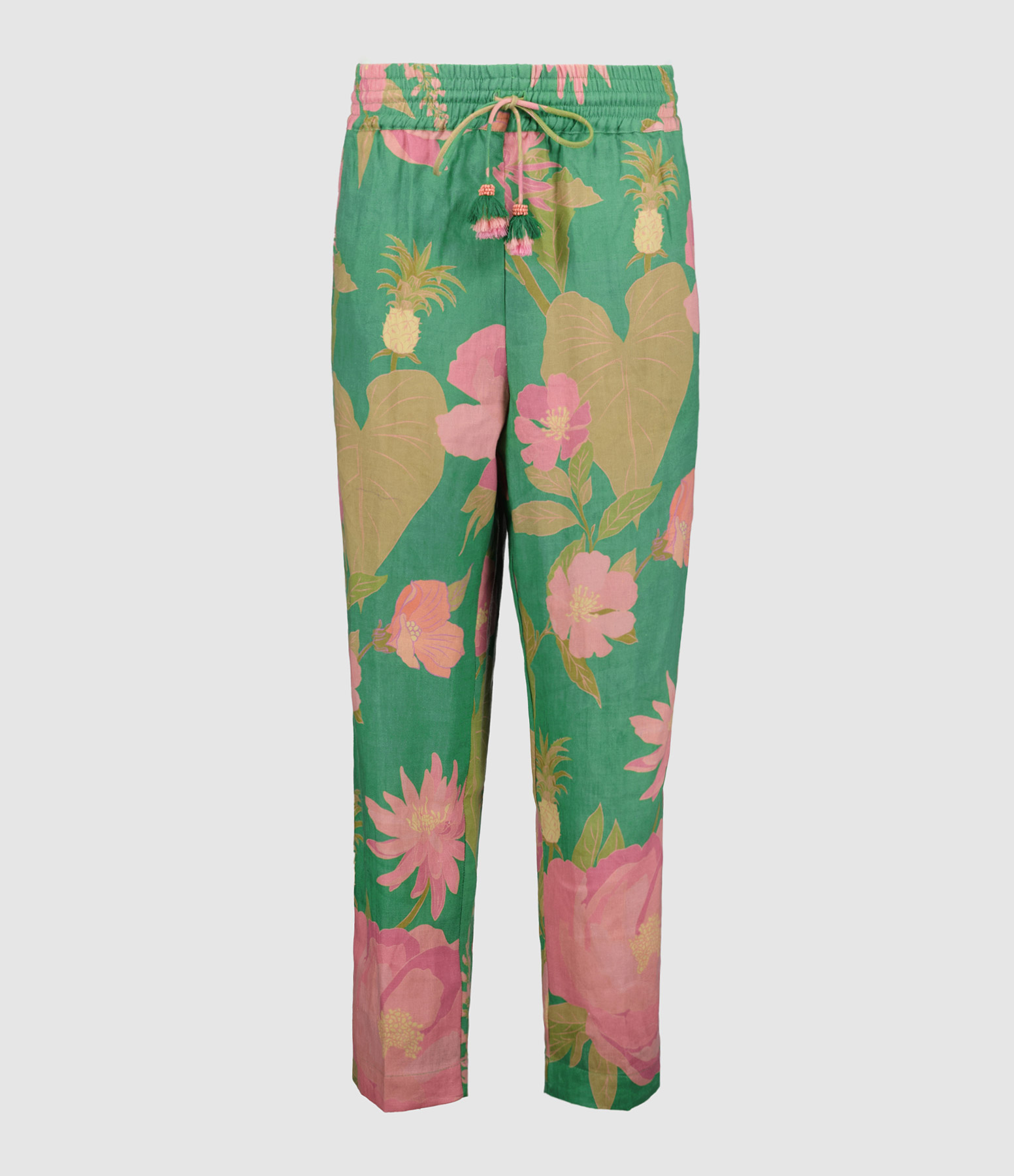Pantalon en lin à imprimé floral multicolore. Taille élastiquée avec cordon de serrage. Coupe droite. Base droite. Deux poches sur les côtés.