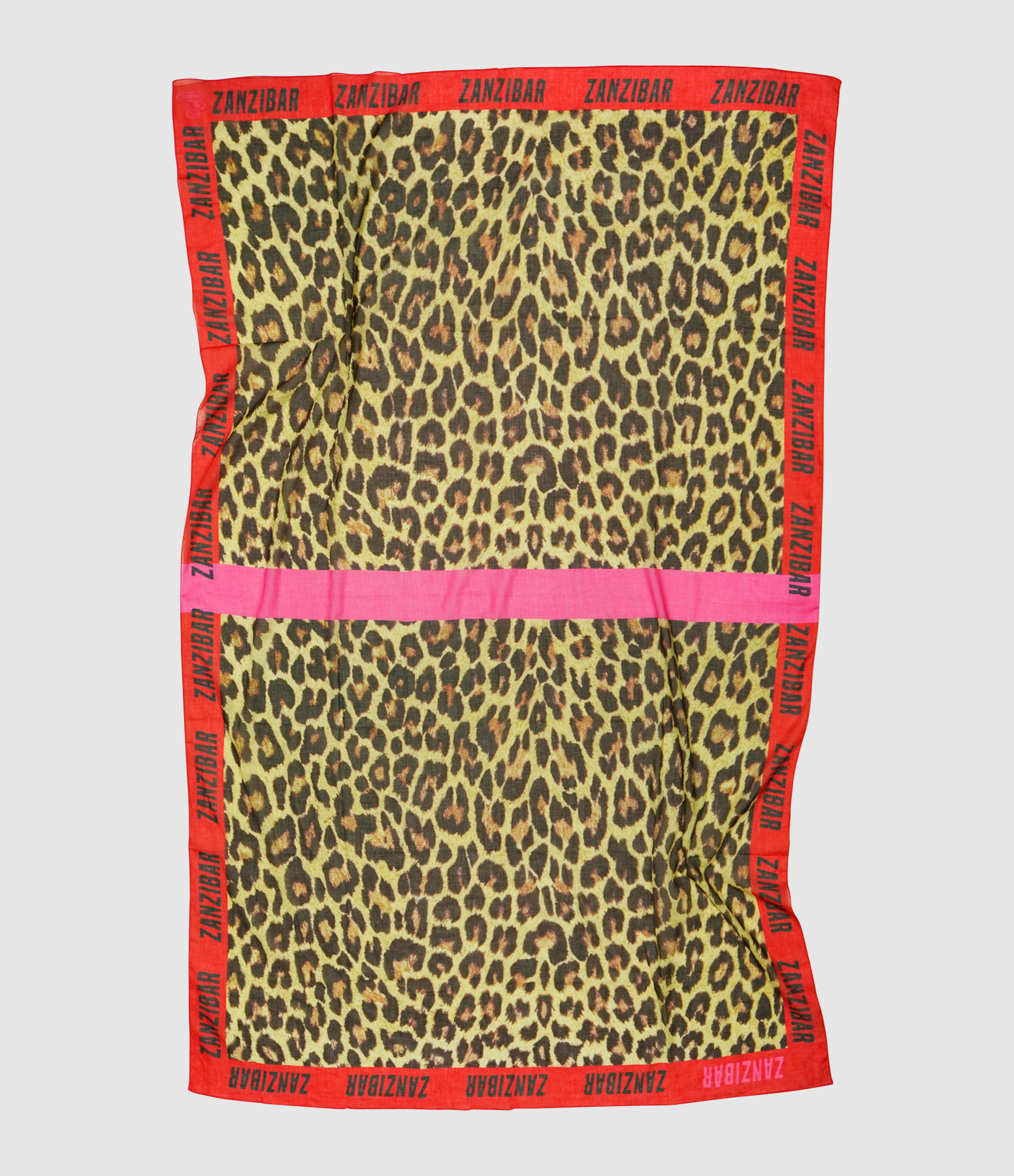Paréo imprimé léopard entouré de bords roses et rouges, avec inscription “Zinzibar”. Léger et fluide.