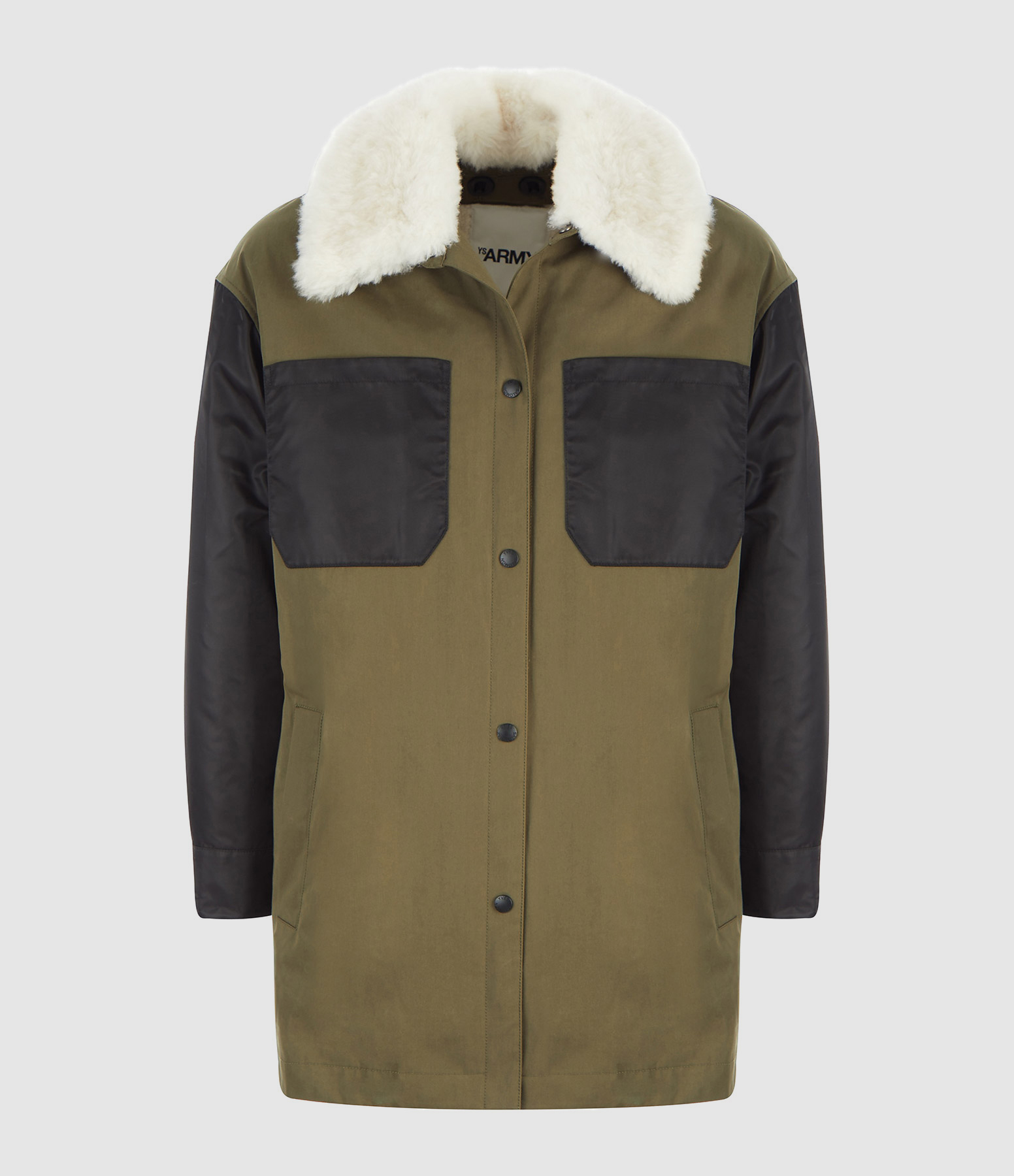 Parka en coton technique imperméable et nylon structuré déperlant kaki et noir. Col amovible en peau lainée ivoire. Manches longues avec doublure en doudounes garnie de plumes et duvet haute qualité. Deux poches plaquées poitrine et deux poches passepoilées avec boutons pressions. Fermeture boutonnée. Coupe droite. Base droite, plus longue à l'arrière. Doublure amovible en peau lainée bouclée.