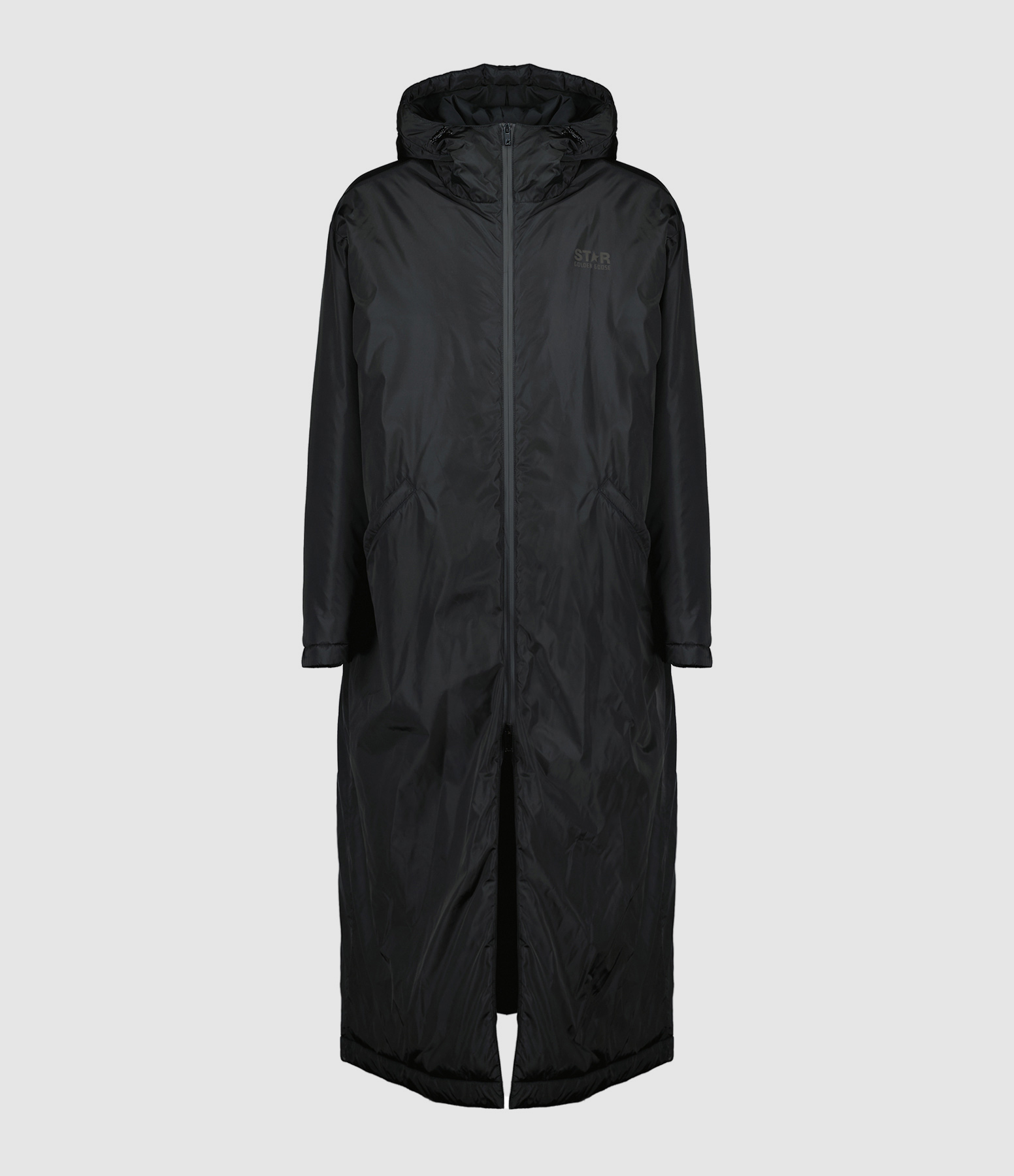 Parka effet doudoune longue noire. Capuche liens de serrages. Manches longues. Logo "STAR GOLDEN GOOSE" sur poitrine gauche. Fermetures zippée avec fente en dessous. Deux poches italiennes latérales avec bouton pressionné. Deux poches plaquées intérieures. Base droite.