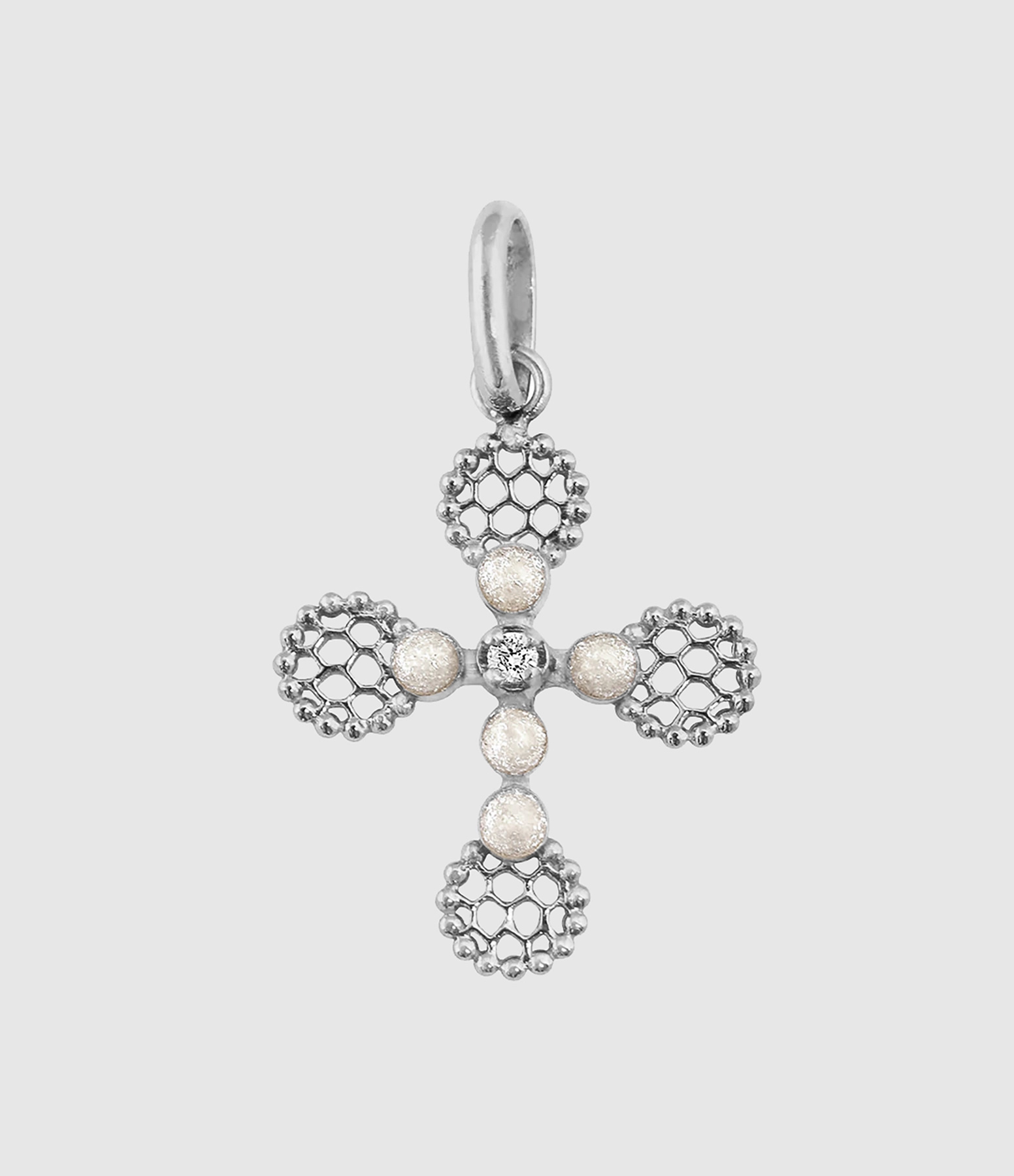 Pendentif Croix Dentelle Résine Diamants Or Blanc