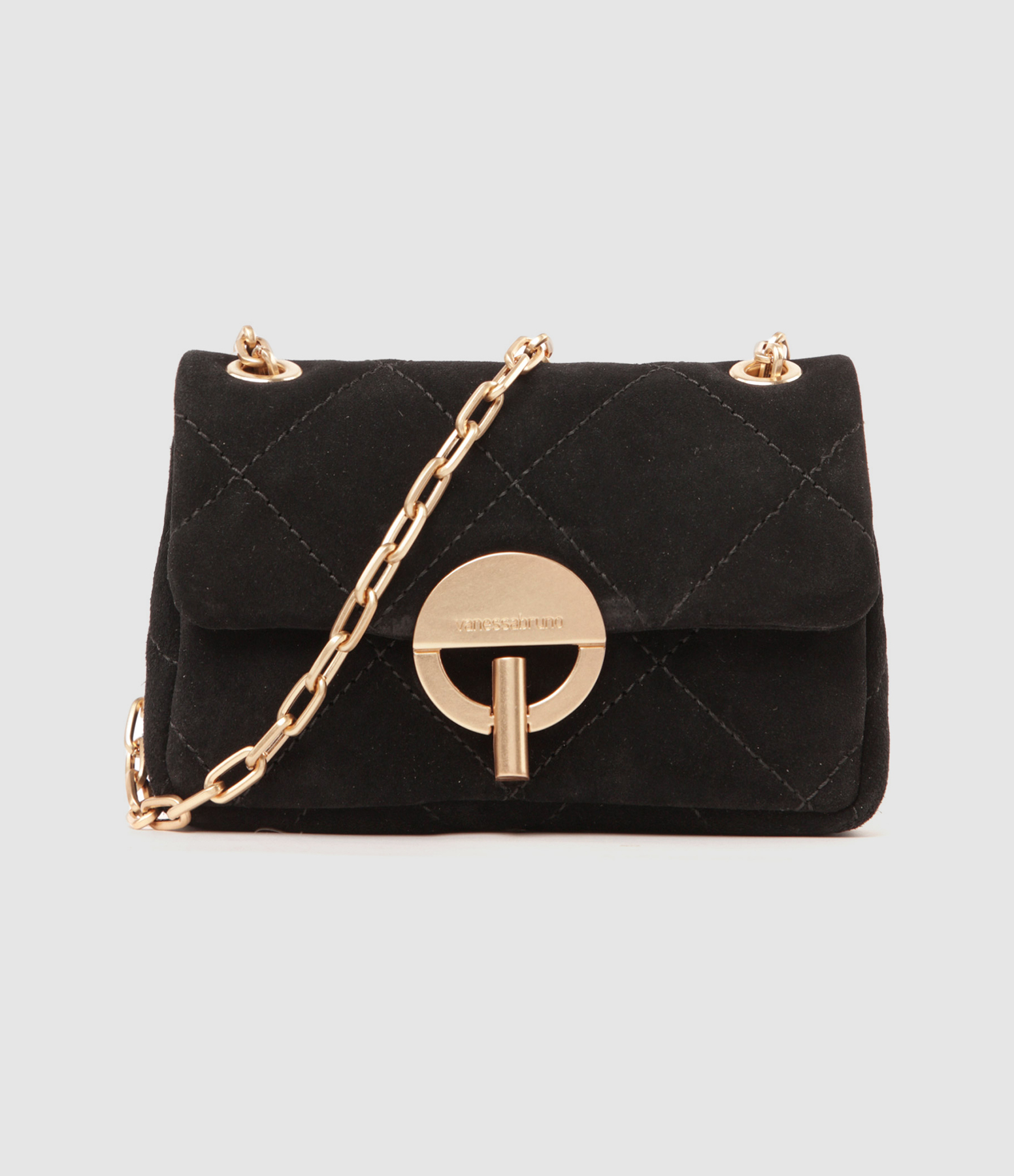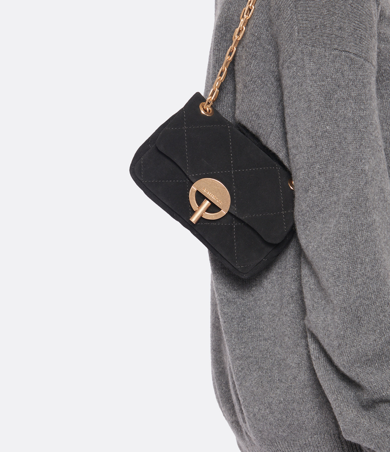 Sac bandoulière à rabat en cuir suédé noir matelassé. Bandoulière en chaîne dorée, possibilité de porter en double chaîne. Fermeture par boucle métallique. Intérieur doublé en coton avec une poche plaquée. Poche plaquée à l'arrière.