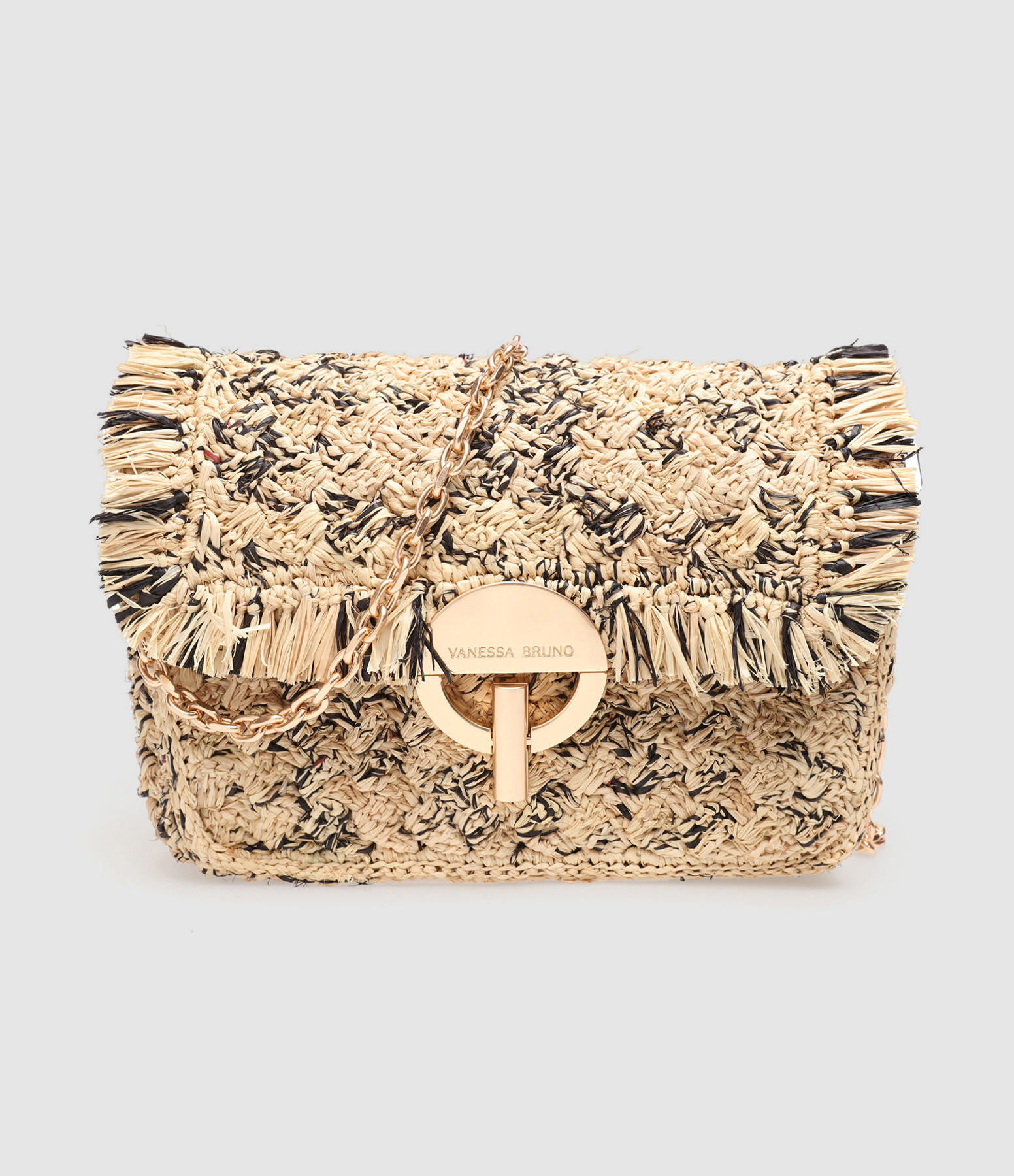 Sac bandoulière en raphia tressé beige et noir. Fermeture par boucle métallique dorée. Bandoulière chaîne métallique dorée de longueur adaptable. Deux poches intérieures dont une poche zippée. Doublure en coton.