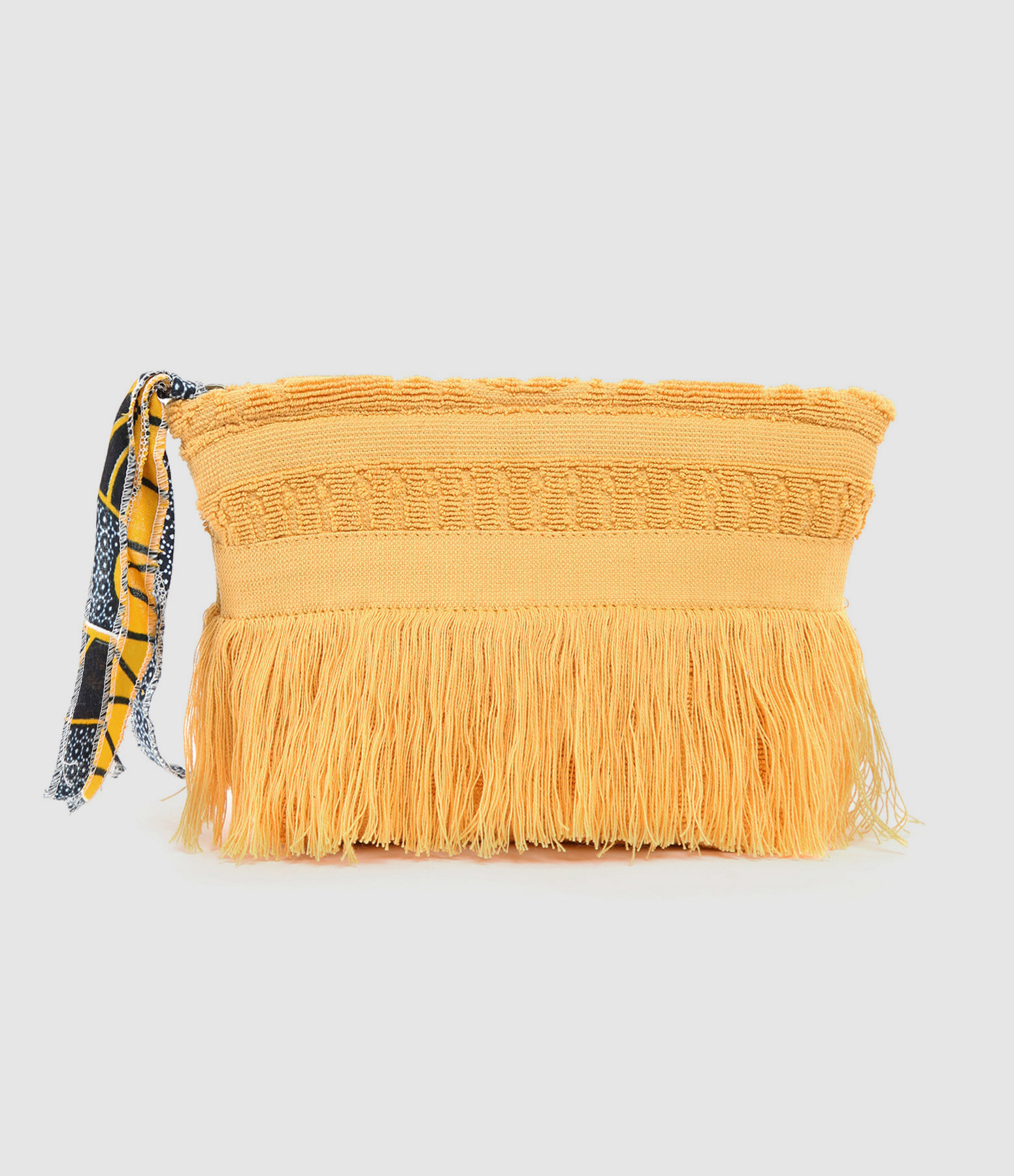 Petite trousse jaune-orange en serviette éponge à motifs texturés. Fermeture par un zip orné d'un pompon. Intérieur doublé en tissu à imprimé wax (motifs africains).