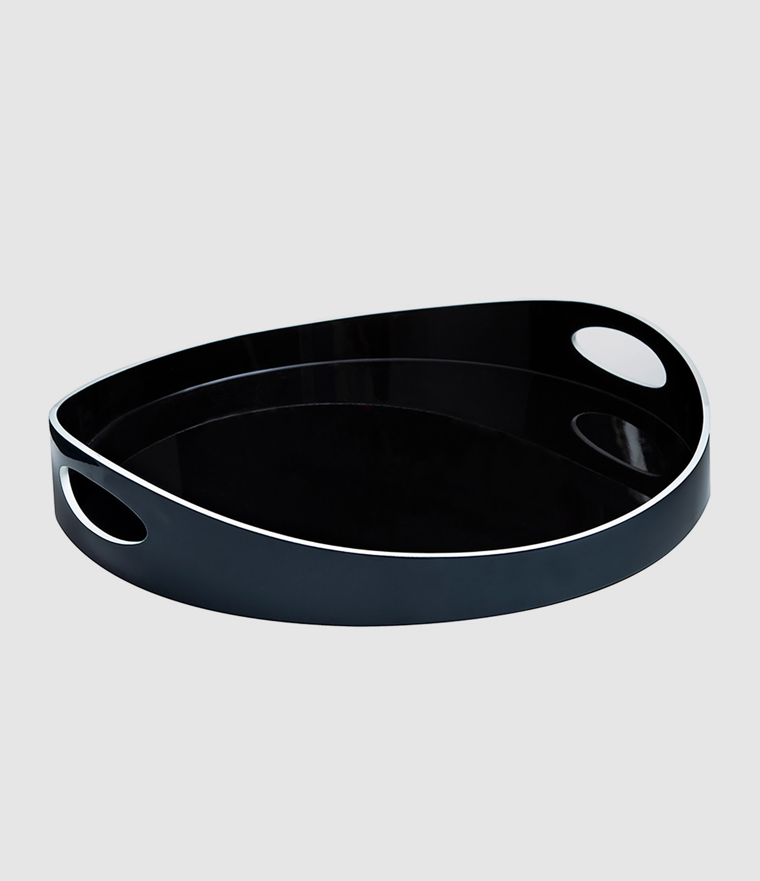 Plateau rond en bois laqué noir et rebords courbés bleu foncé. Finition brillante.