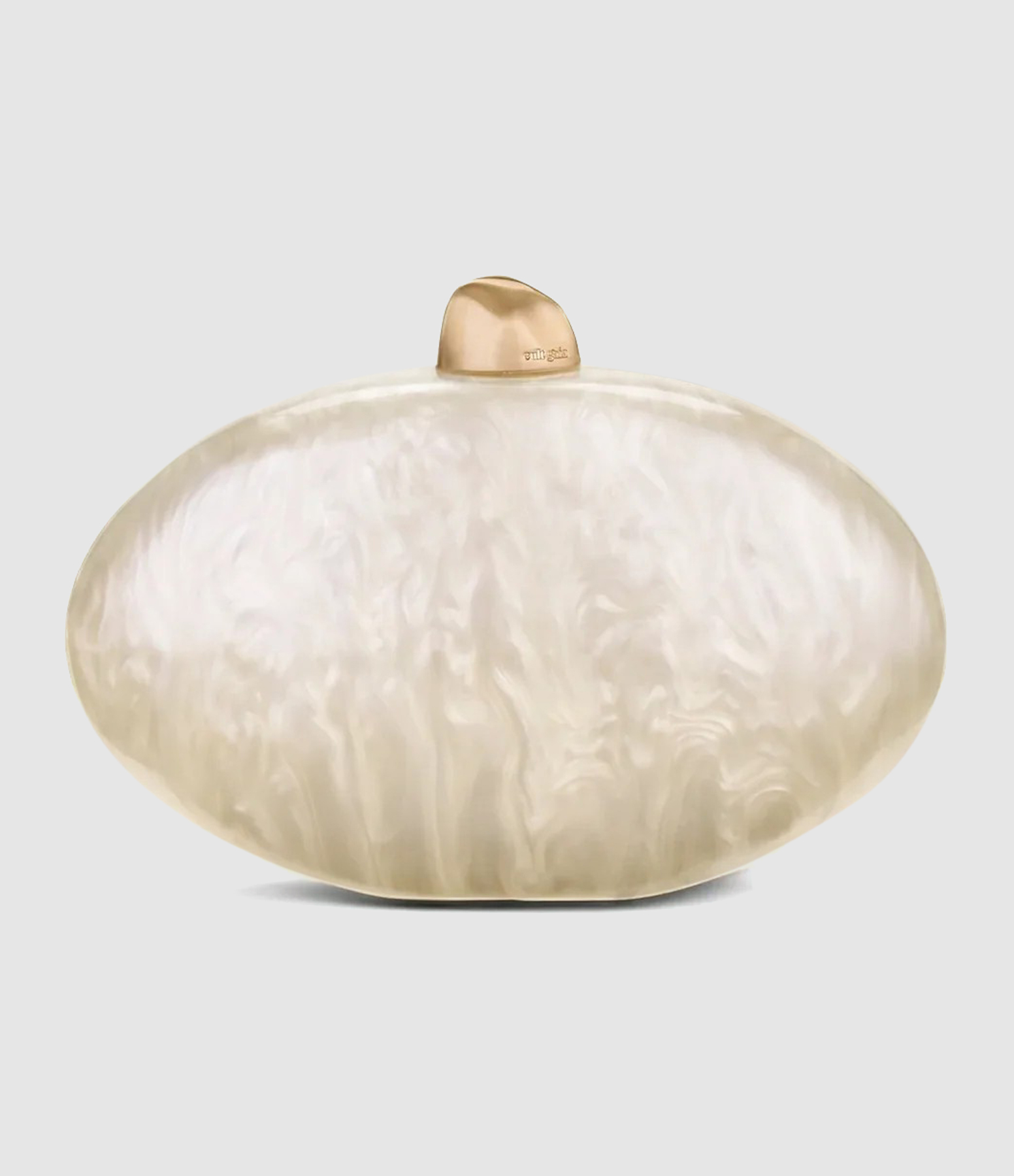 Pochette ovale en acrylique nacré avec fermoir abstrait doré et bandoulière chaîne amovible.