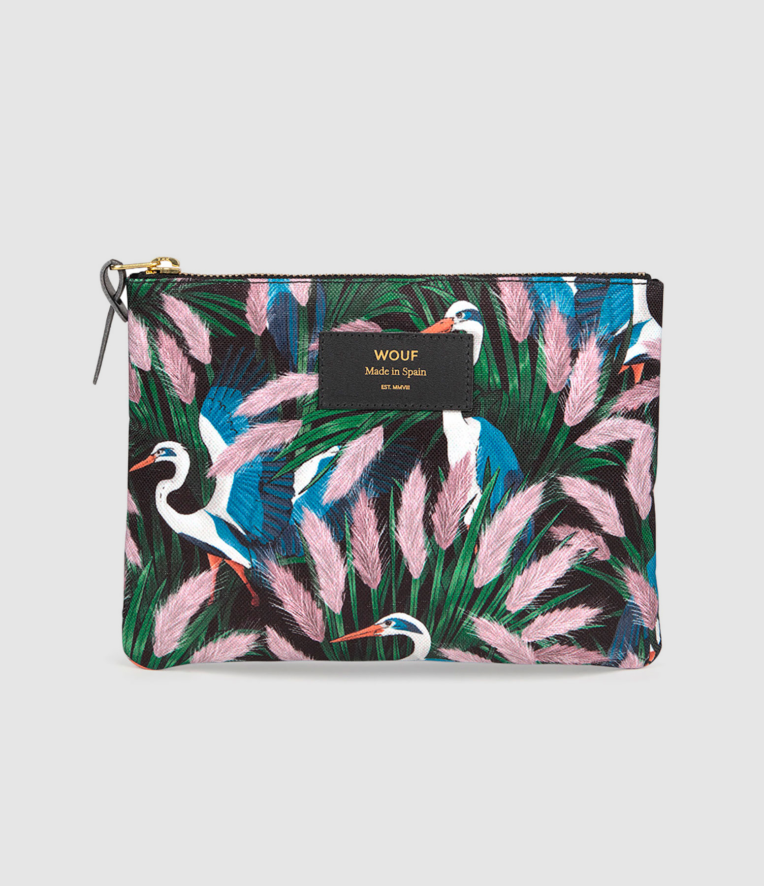 Trousse rectangle en toile recyclée, imprimé hérons. Fermeture glissière YKK recyclée. Résistante à l'eau. Encres écologiques.