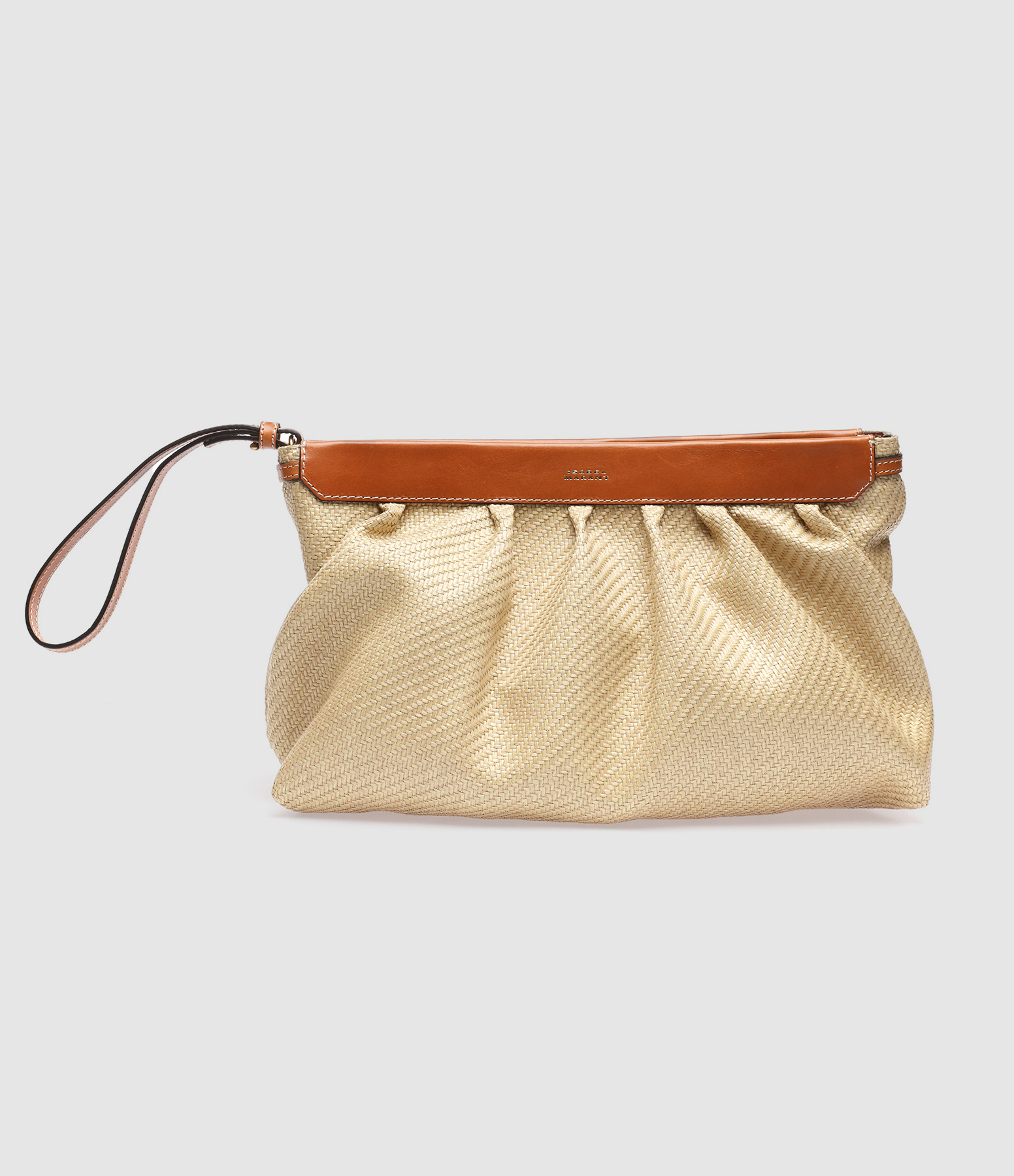 Pochette slouchy en effet raphia et cuir marron. Fermeture par zip. Une poche plaquée à l'intérieur. Intérieur doublé.
