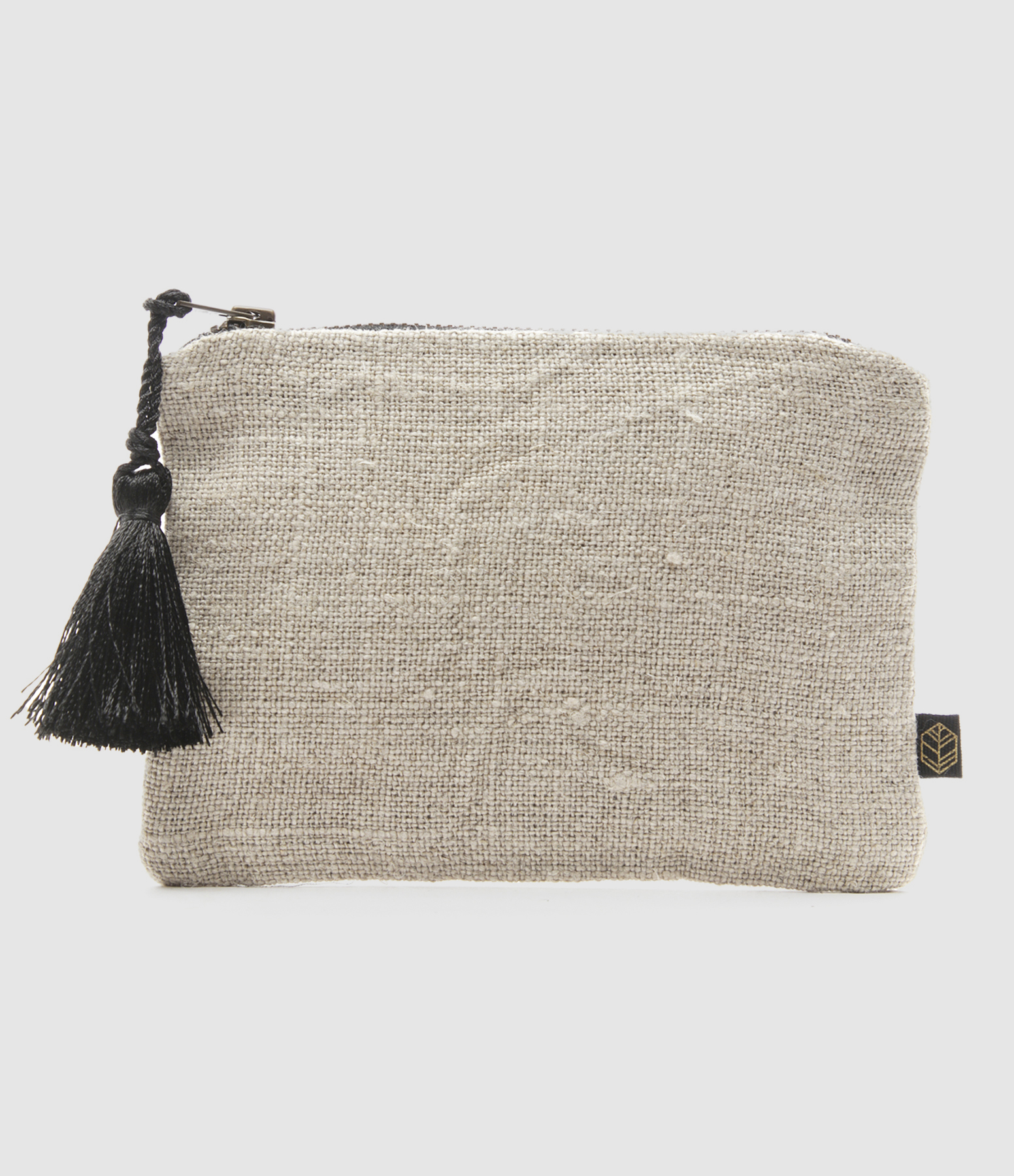 Pochette en lin beige. Fermeture éclair avec pompon.