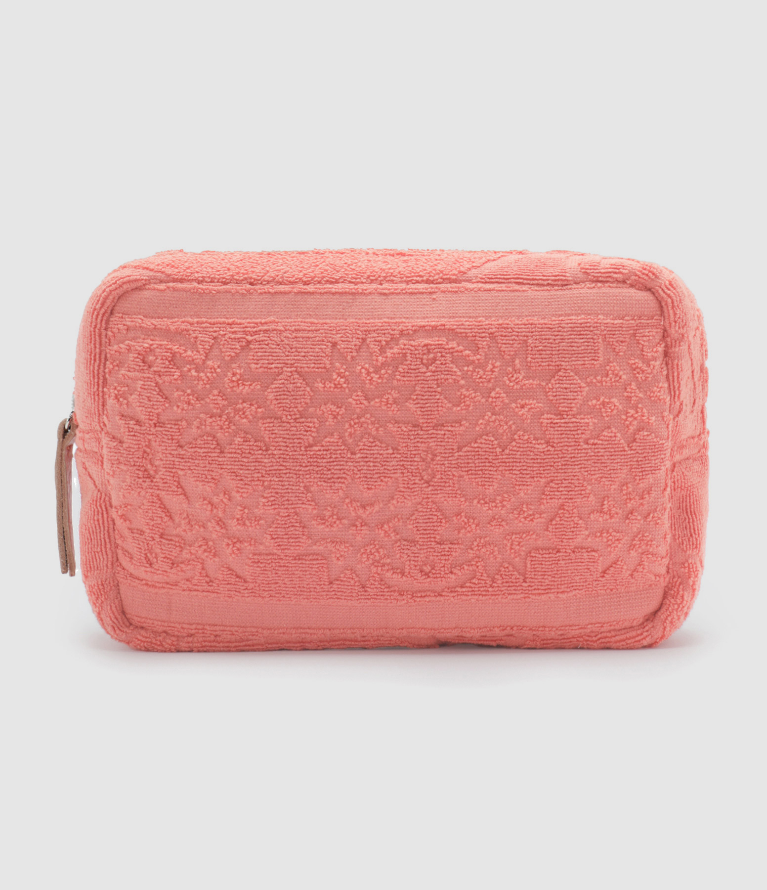 Pochette corail en serviette éponge à motifs texturés. Fermeture par un zip. Intérieur doublé en tissu à imprimé wax (motifs africains). Poche plaquée avec un bouton pression à l'intérieur.
