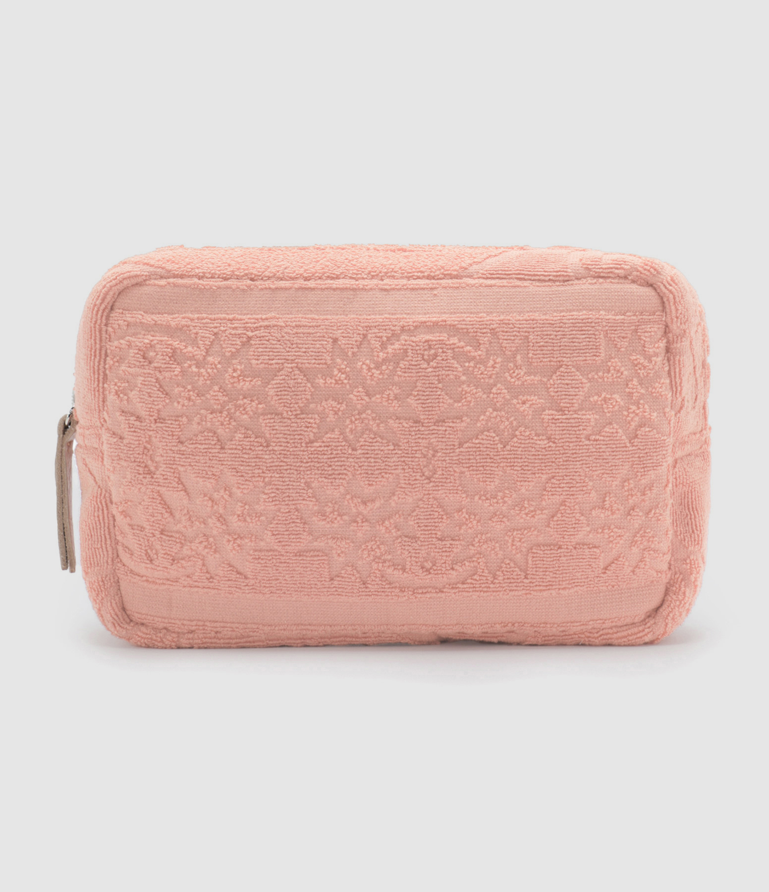 Pochette en serviette éponge à motifs texturés. Fermeture par un zip. Intérieur doublé en tissu à imprimé wax (motifs africains). Poche plaquée avec un bouton pression à l'intérieur.