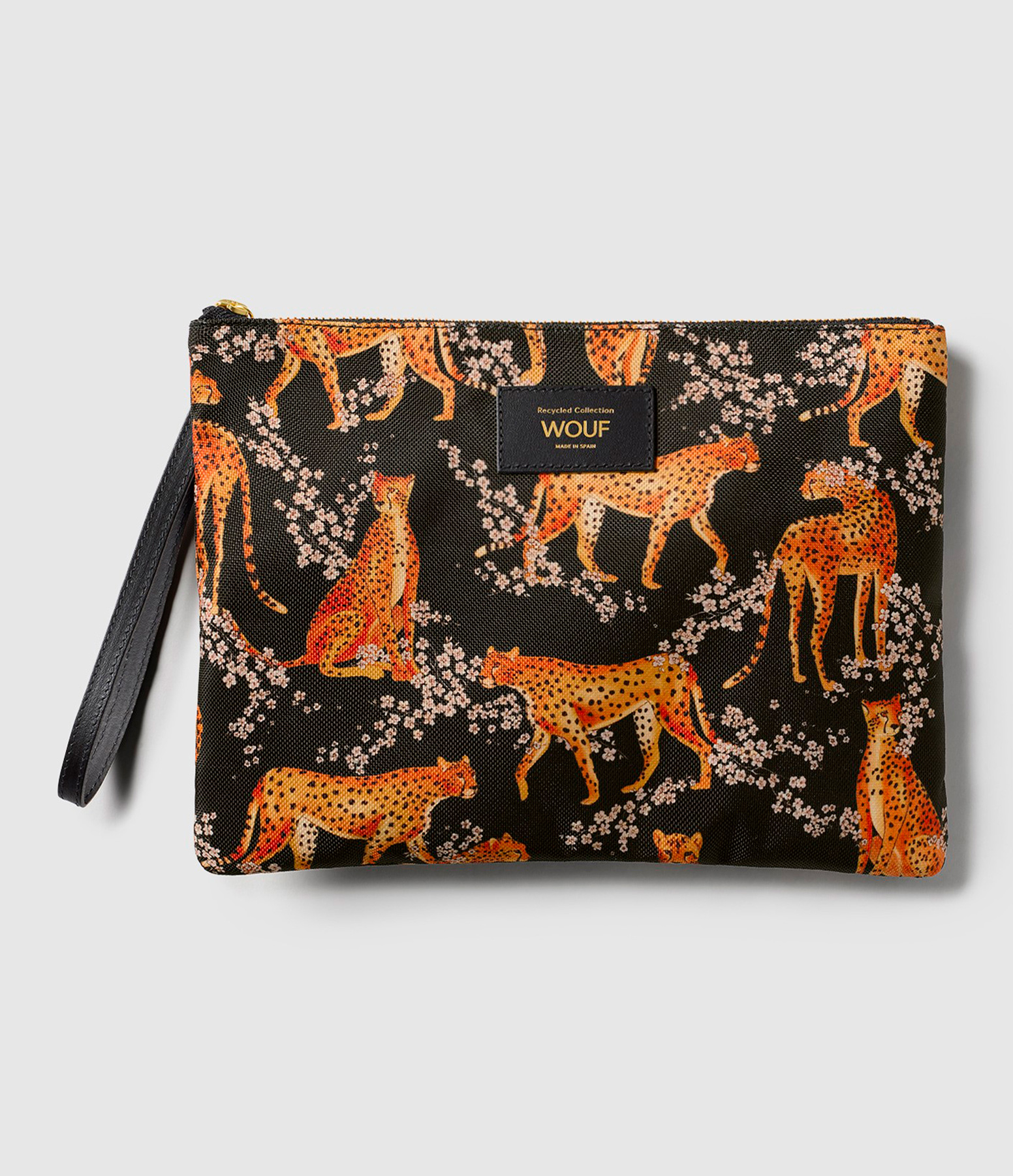 Grande trousse rectangle en toile recyclée à imprimé tigre. Dragonne en cuir recyclé. Fermeture glissière YKK recyclée. Résistante à l'eau. Encres écologiques.