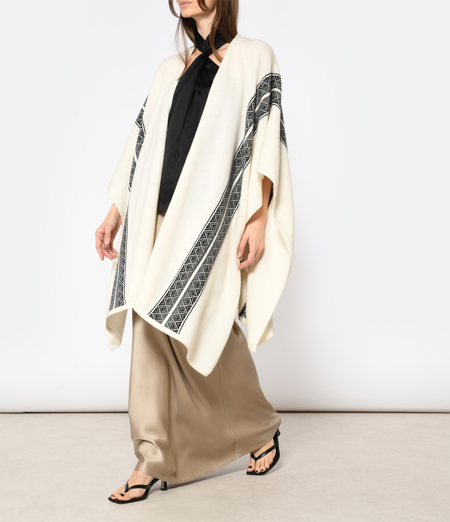 Poncho en cachemire écru. Imprimé noire. Coupe droite.