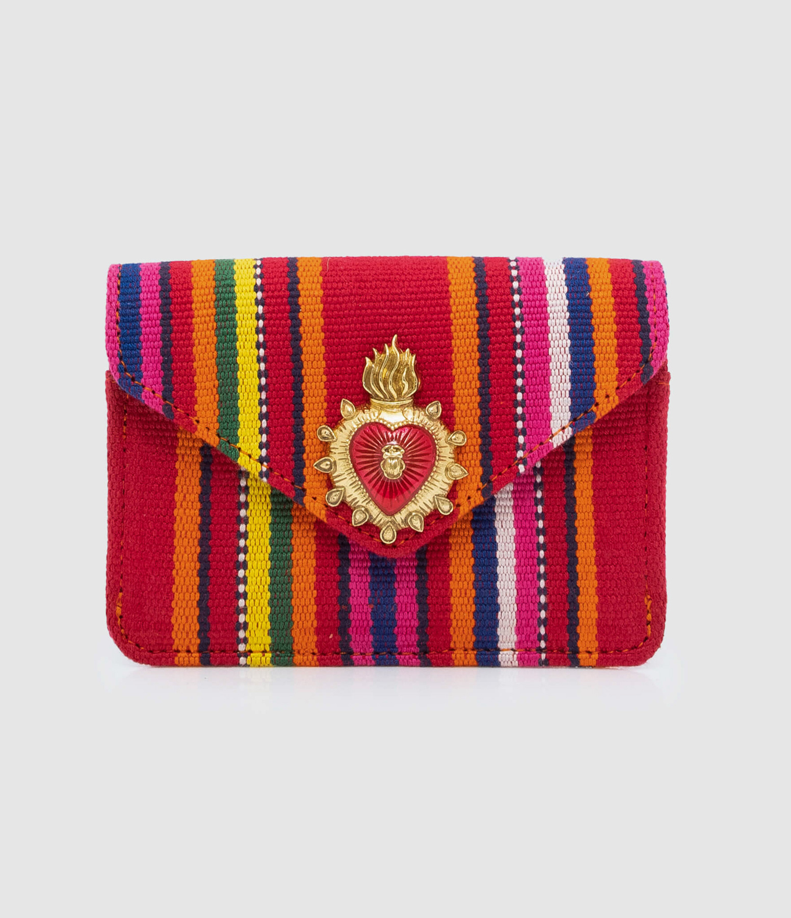 Porte-cartes en coton à rayures multicolores avec bijou Ex Voto. Forme enveloppe. Fermeture par aimant. Deux compartiments dont un zippé et le deuxième avec poche plaquée. Doublure en cuir de nubuck.