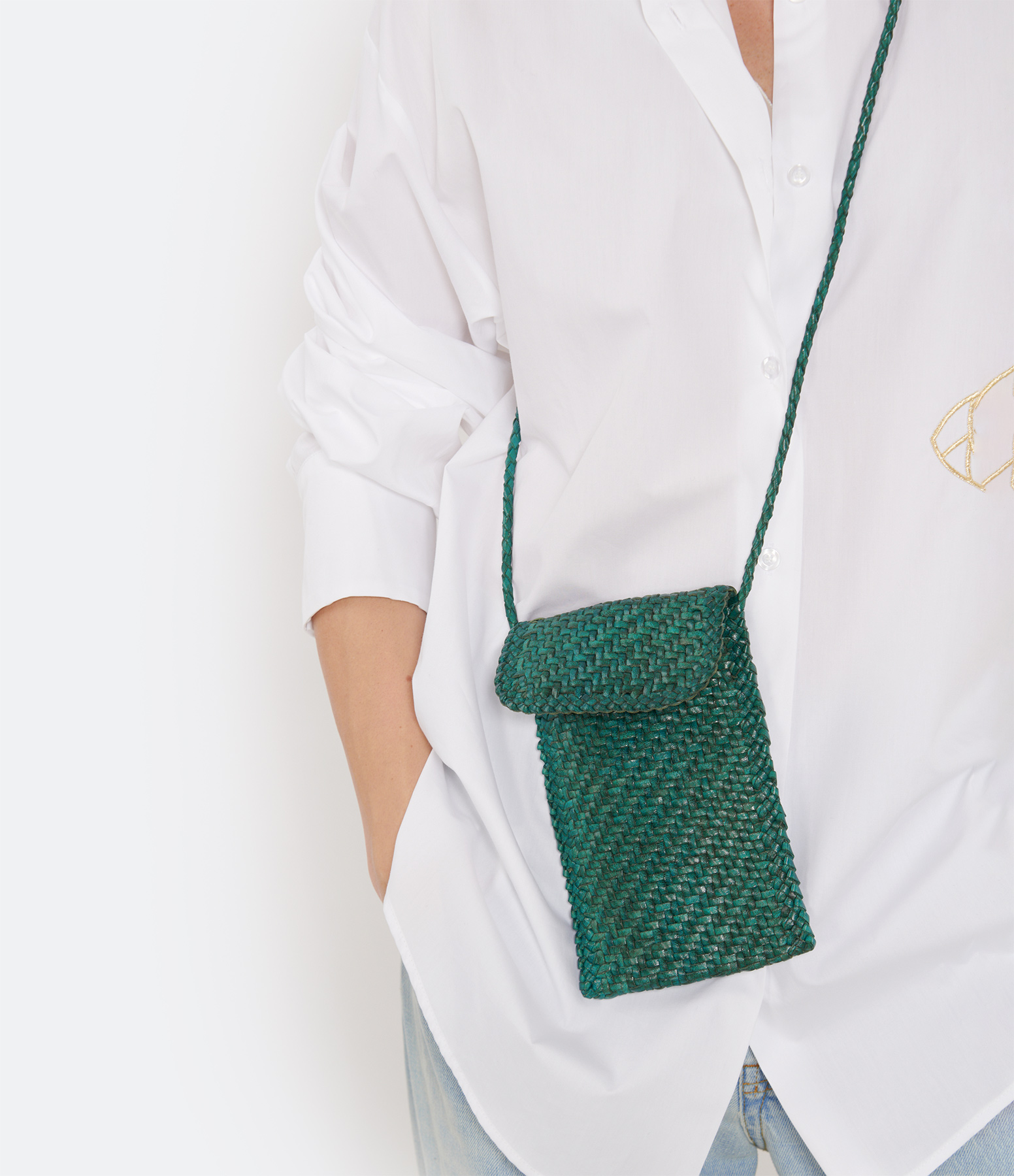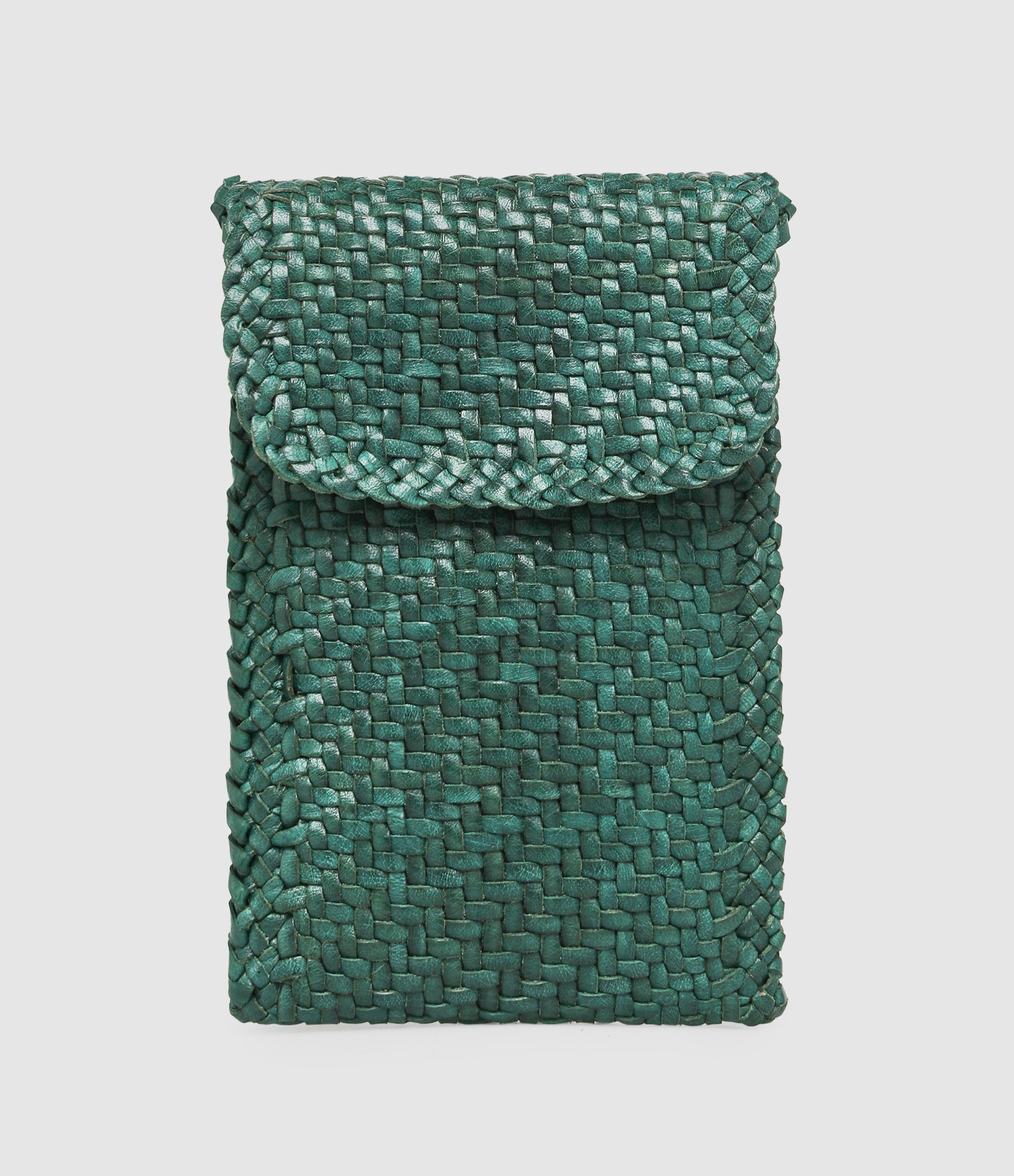 Porte téléphone en cuir tressé vert. Bandoulière pour un porté cross body. Un grand compartiment fermé par un rabat.
