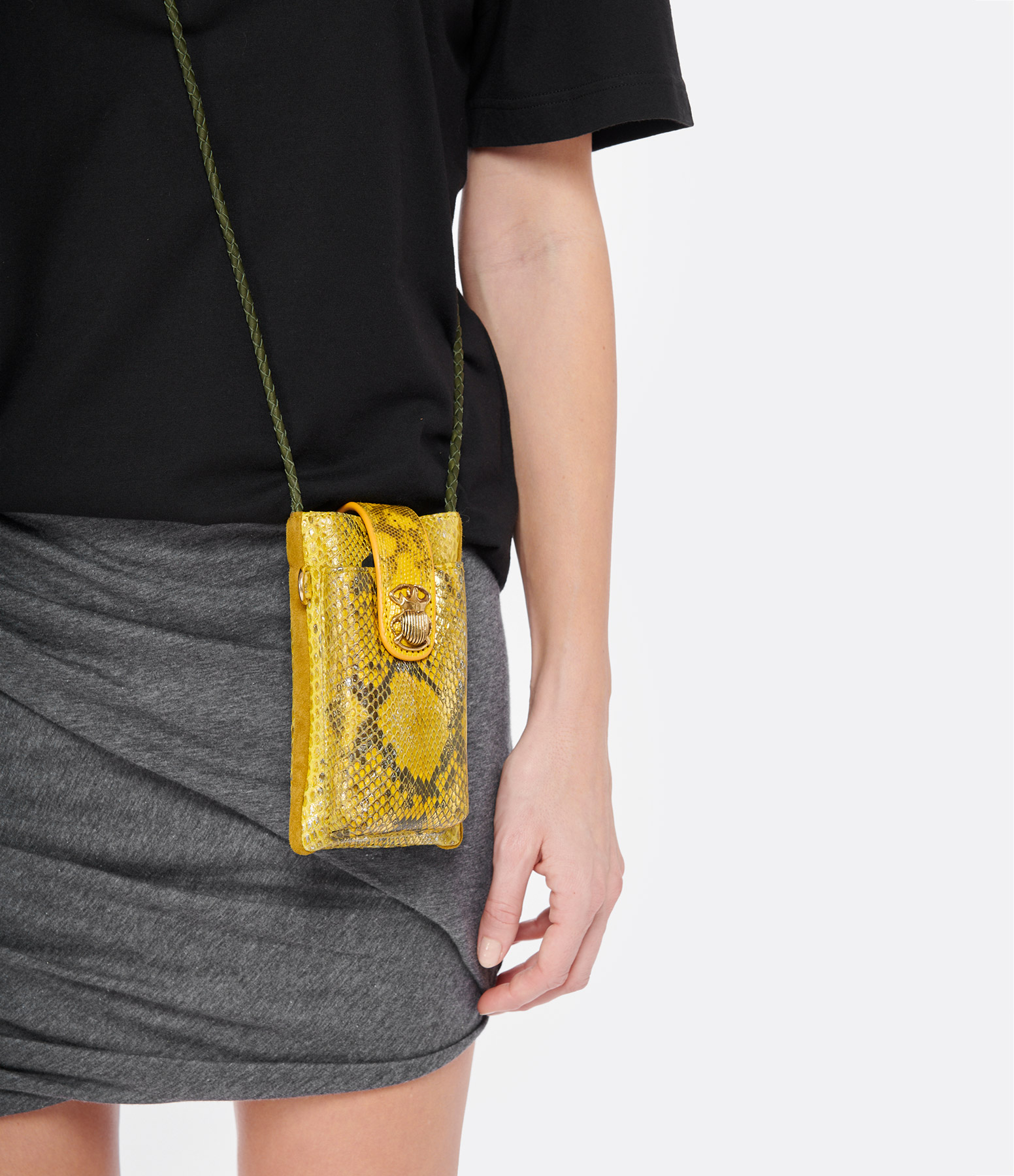 Petit sac porte-téléphone en python jaune. Boucle scarabée dorée et rabat aimanté. Trois porte-cartes au dos. Deux poches : une grande poche téléphone et une petite à l'avant. Intérieur doublé en coton.